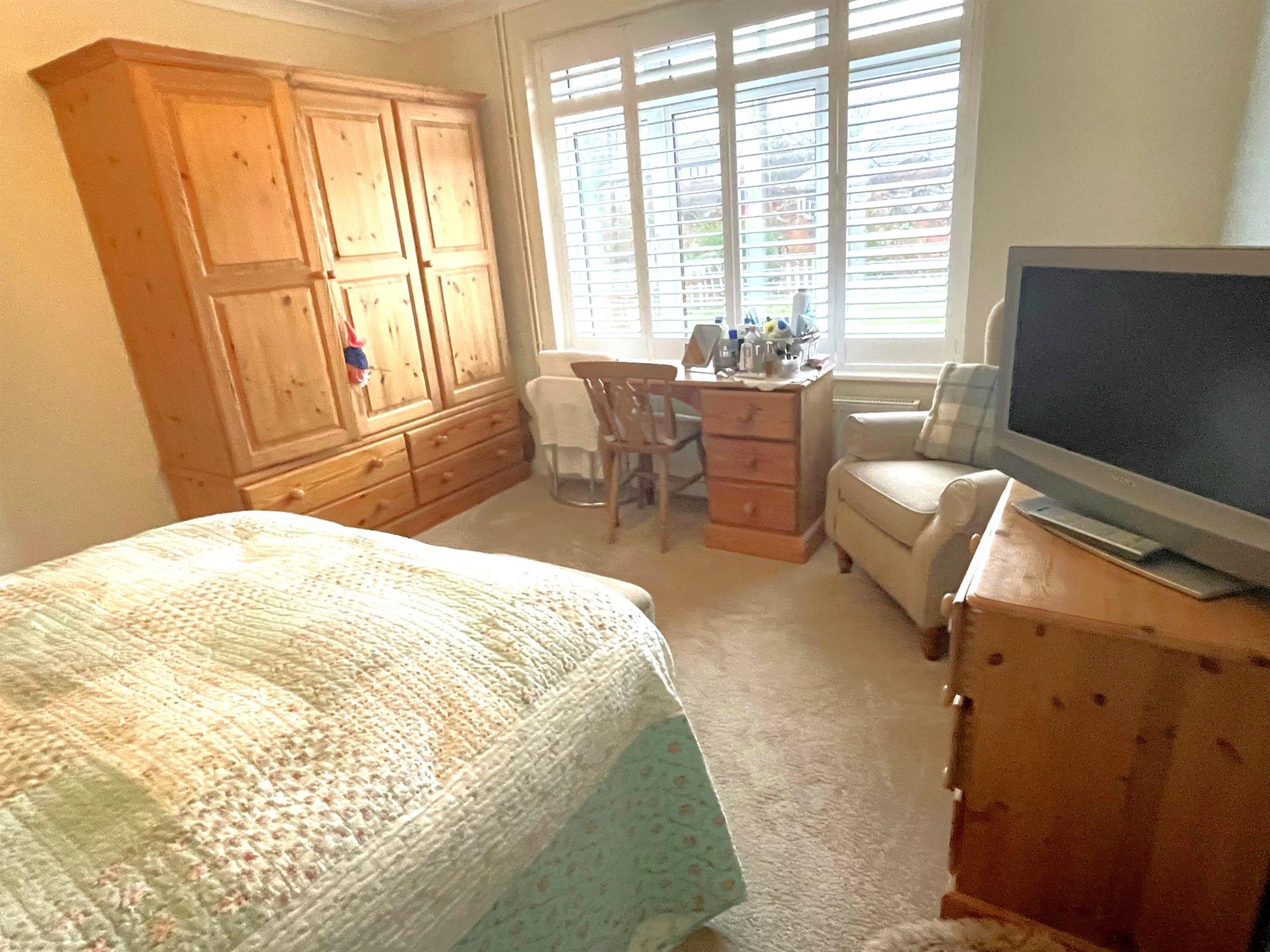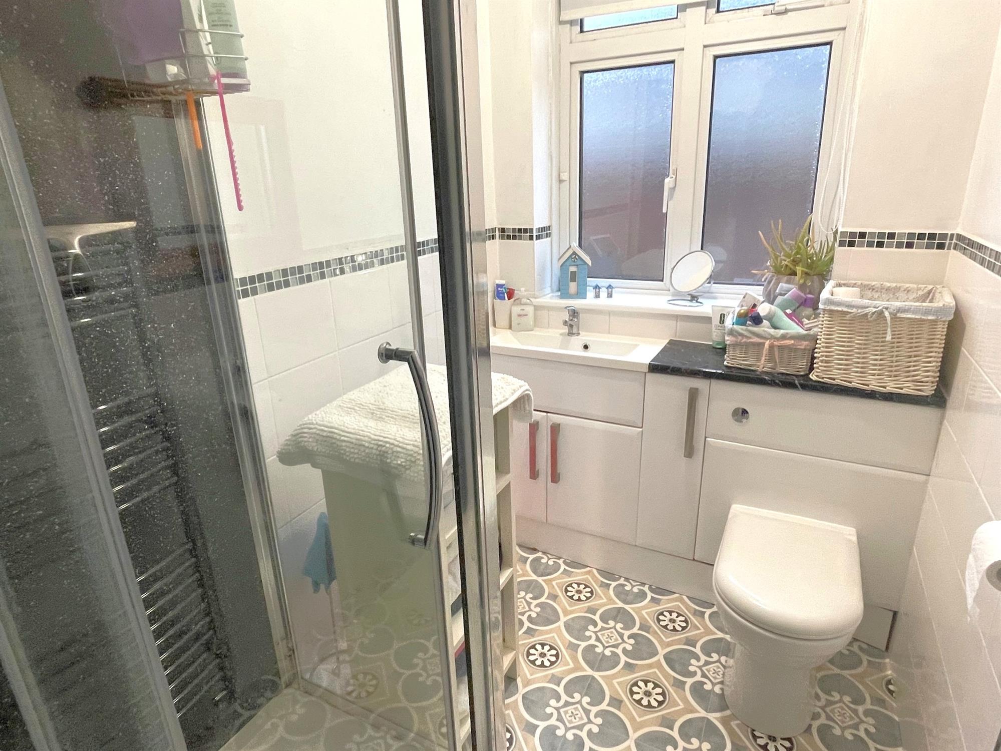 Window to side. Low level WC with concealed flush. Inset wash hand basin with cupboard below. Glazed shower unit with rain effect shower head. Heated towel radiator.