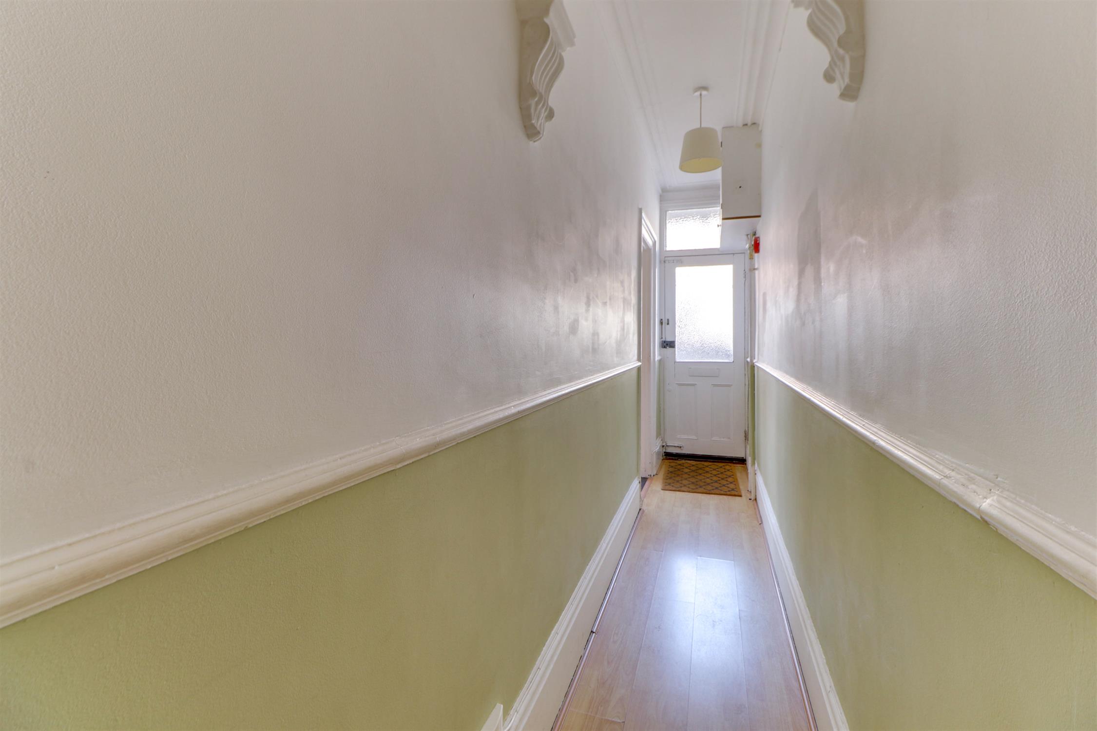 Smooth ceiling, ornate cornicing, ceiling arch, cupboard housing meters, stairs rising to first floor landing, laminate flooring and doors into;