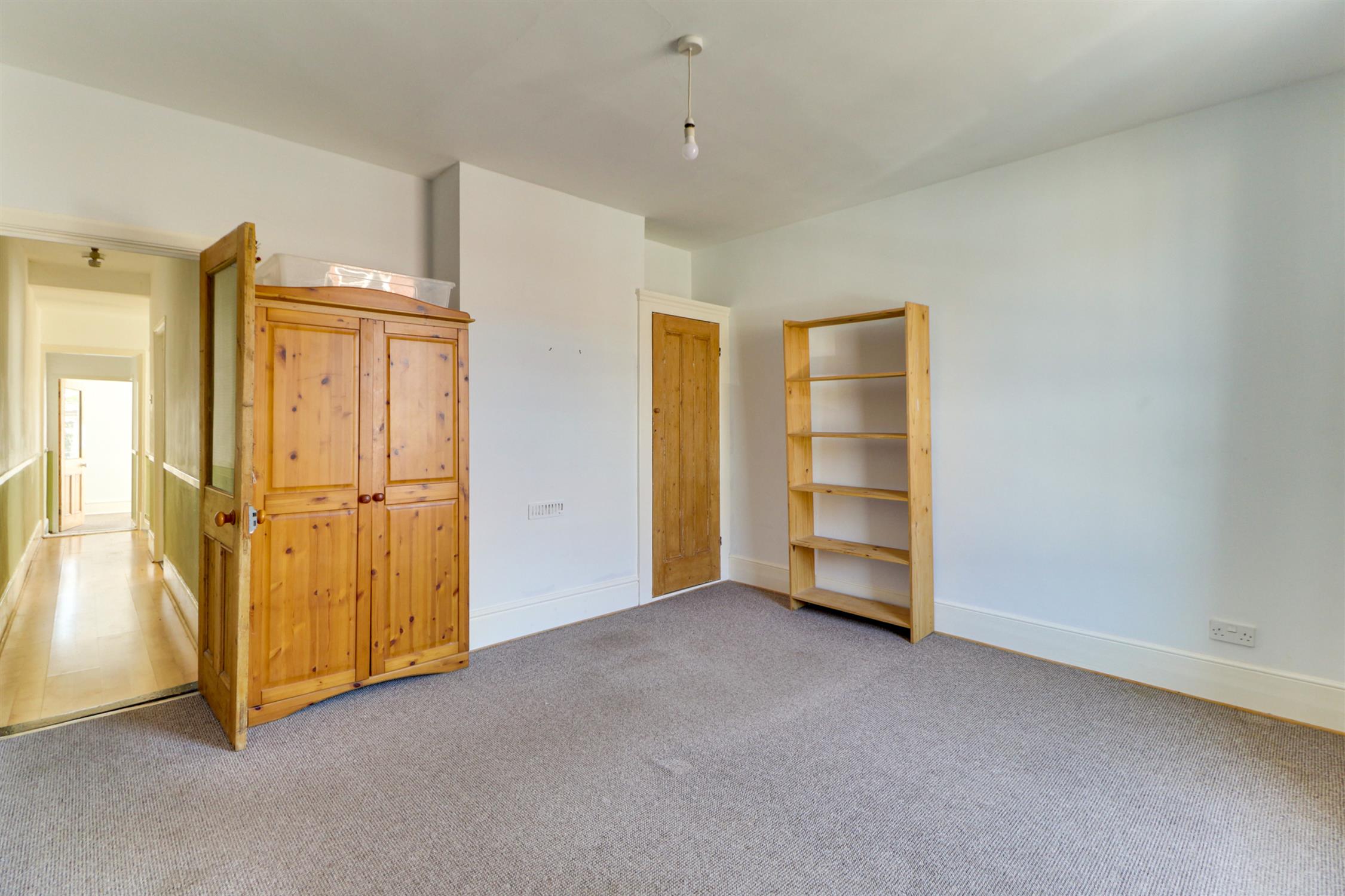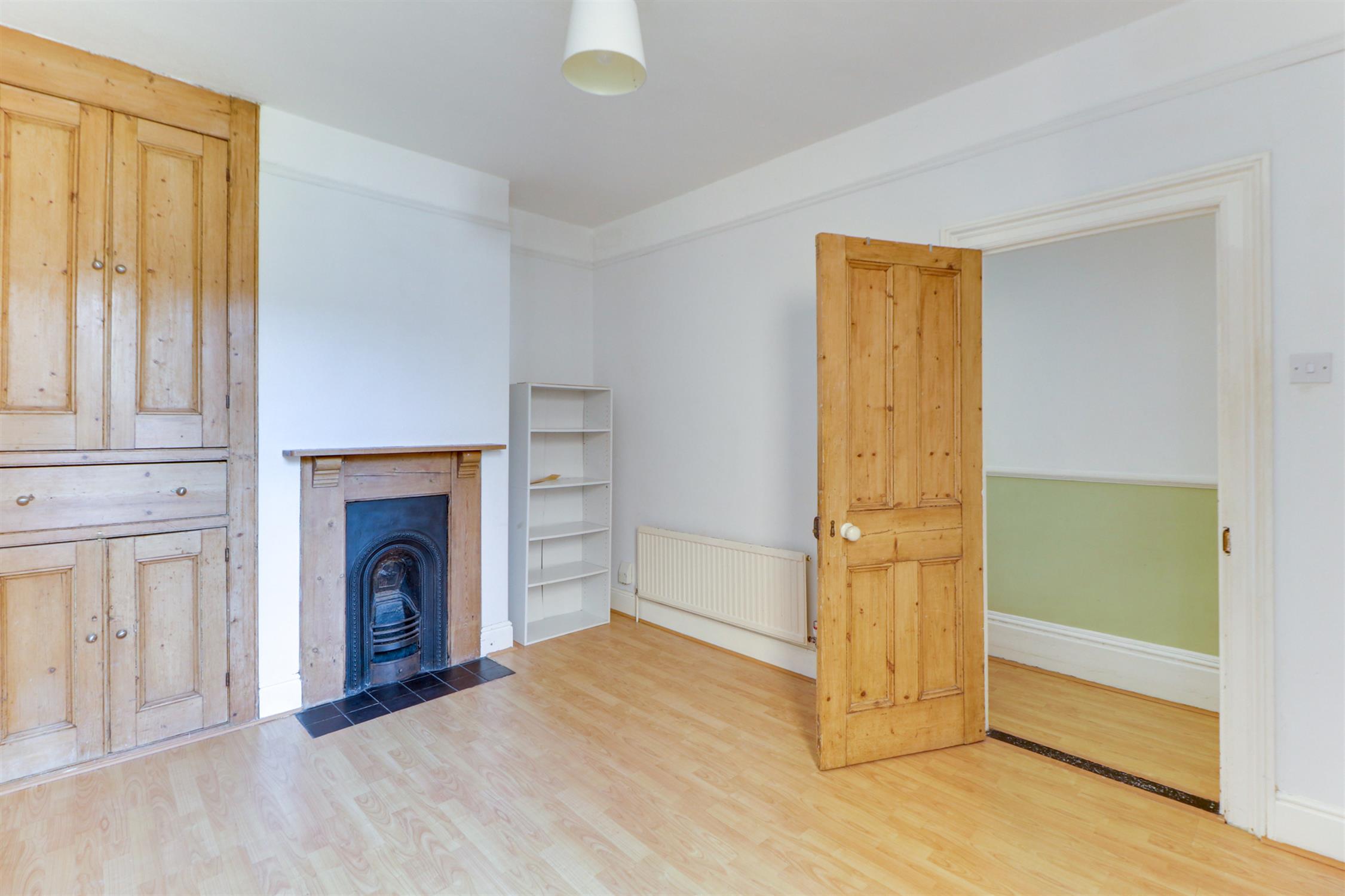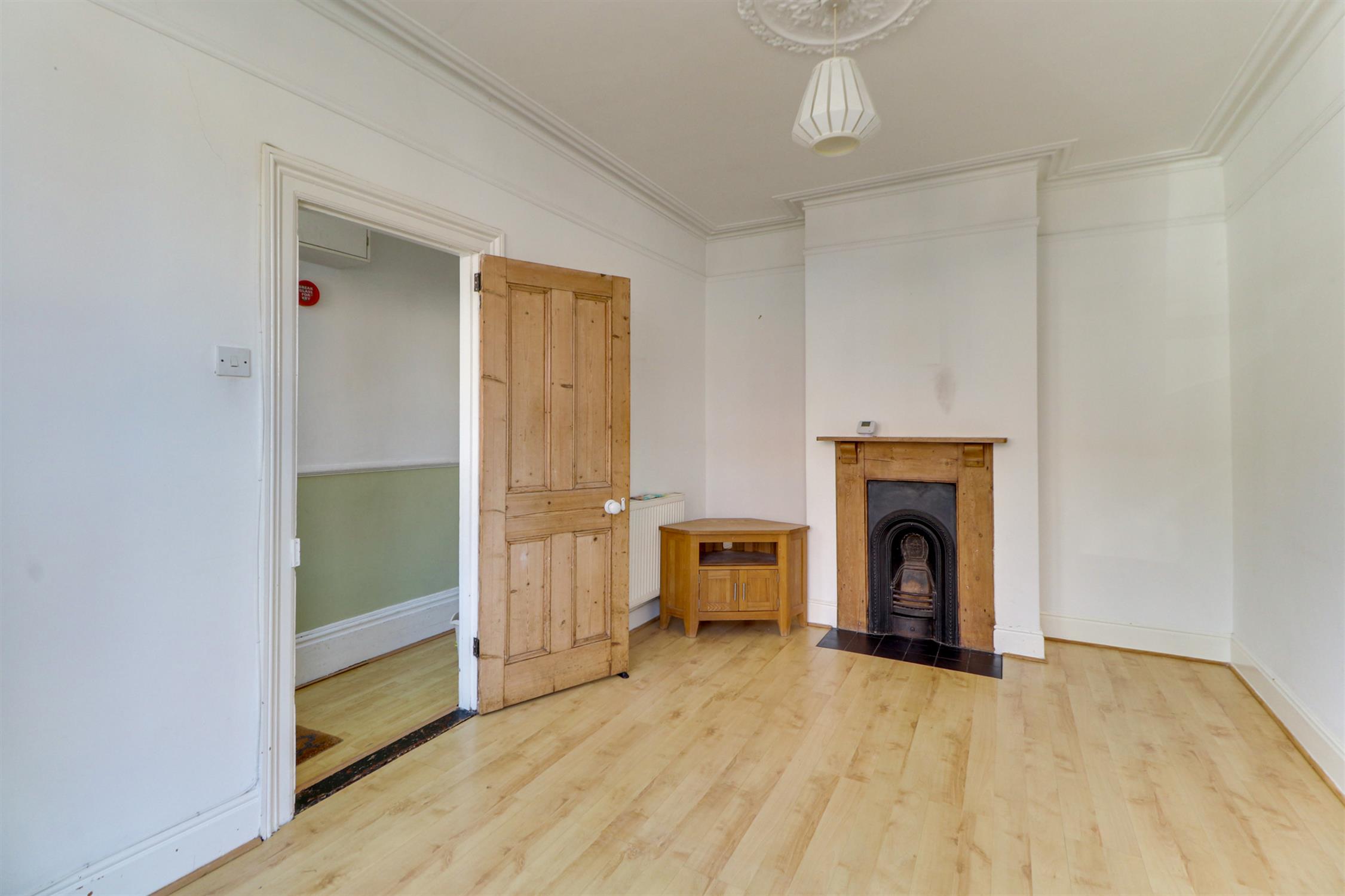 Smooth ceiling, UPVC double-glazed side aspect bay window, period fireplace with feature surround, storage cupboard and laminate flooring.