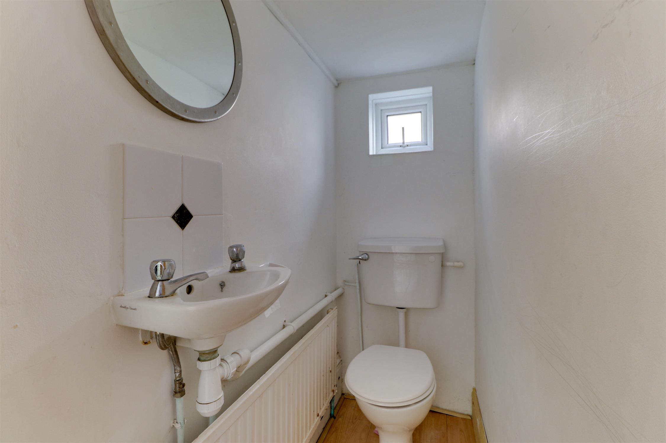 Wooden panelled ceiling, obscured UPVC double-glazed window, wash hand basin, tiled splash back, low level W.C, radiator and laminate flooring.