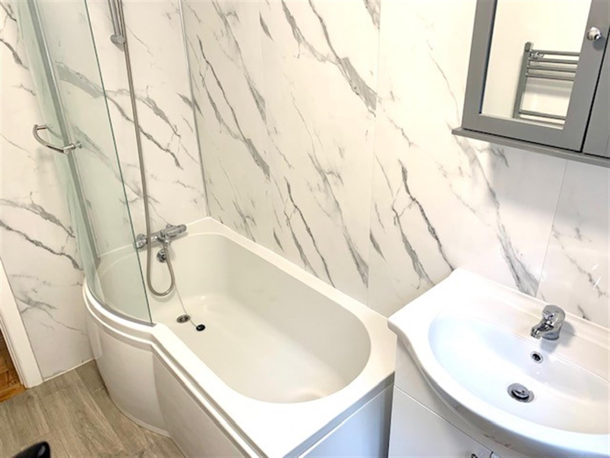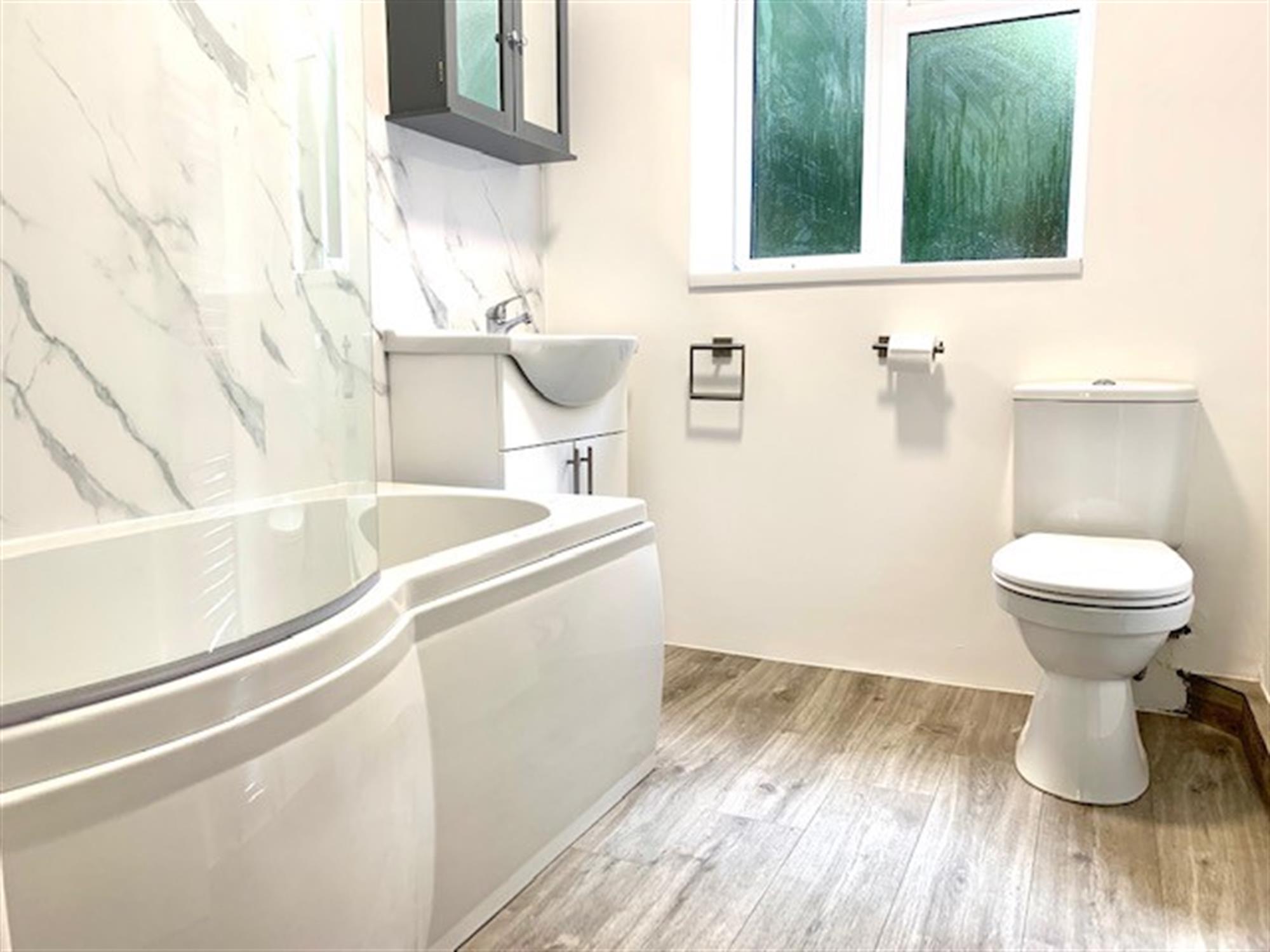 BATHROOM - Modern fitted bathroom with w.c., sink with vanity below and bath with shower over.