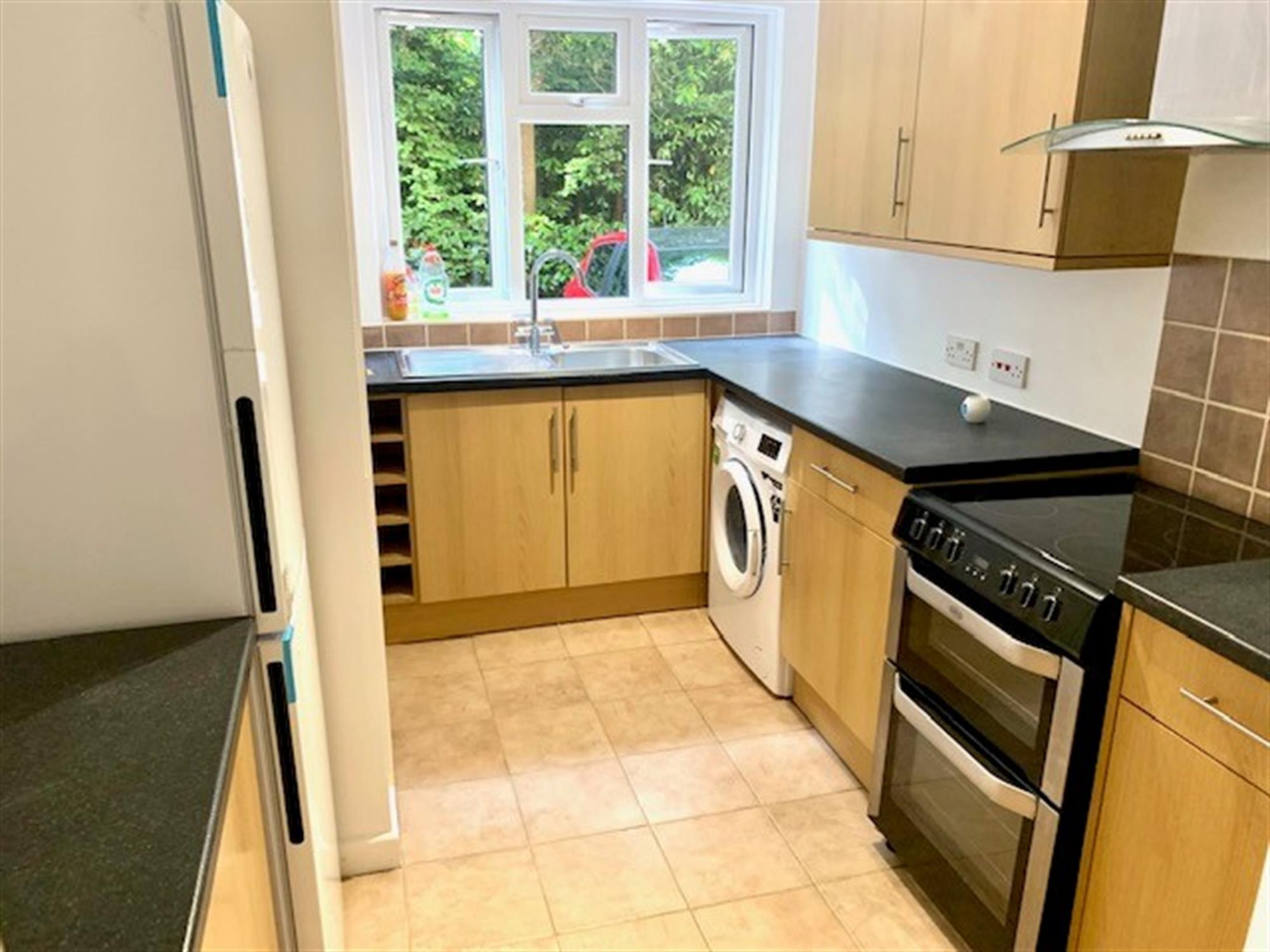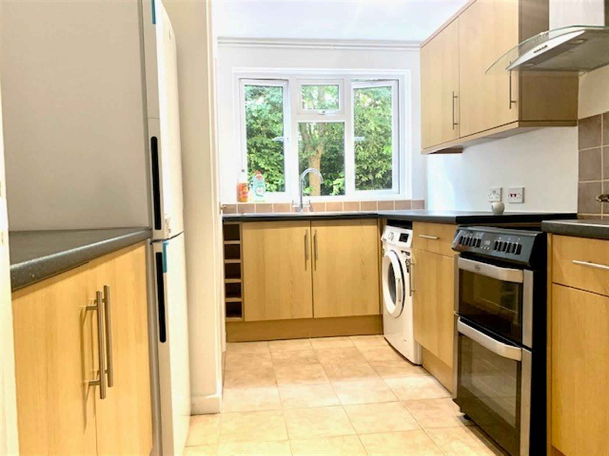 KITCHEN - Modern fitted kitchen with various wall and base units. Window to rear. Appliances comprises: washing machine, fridge/freezer, electric hob and electric oven. Cupboard off.