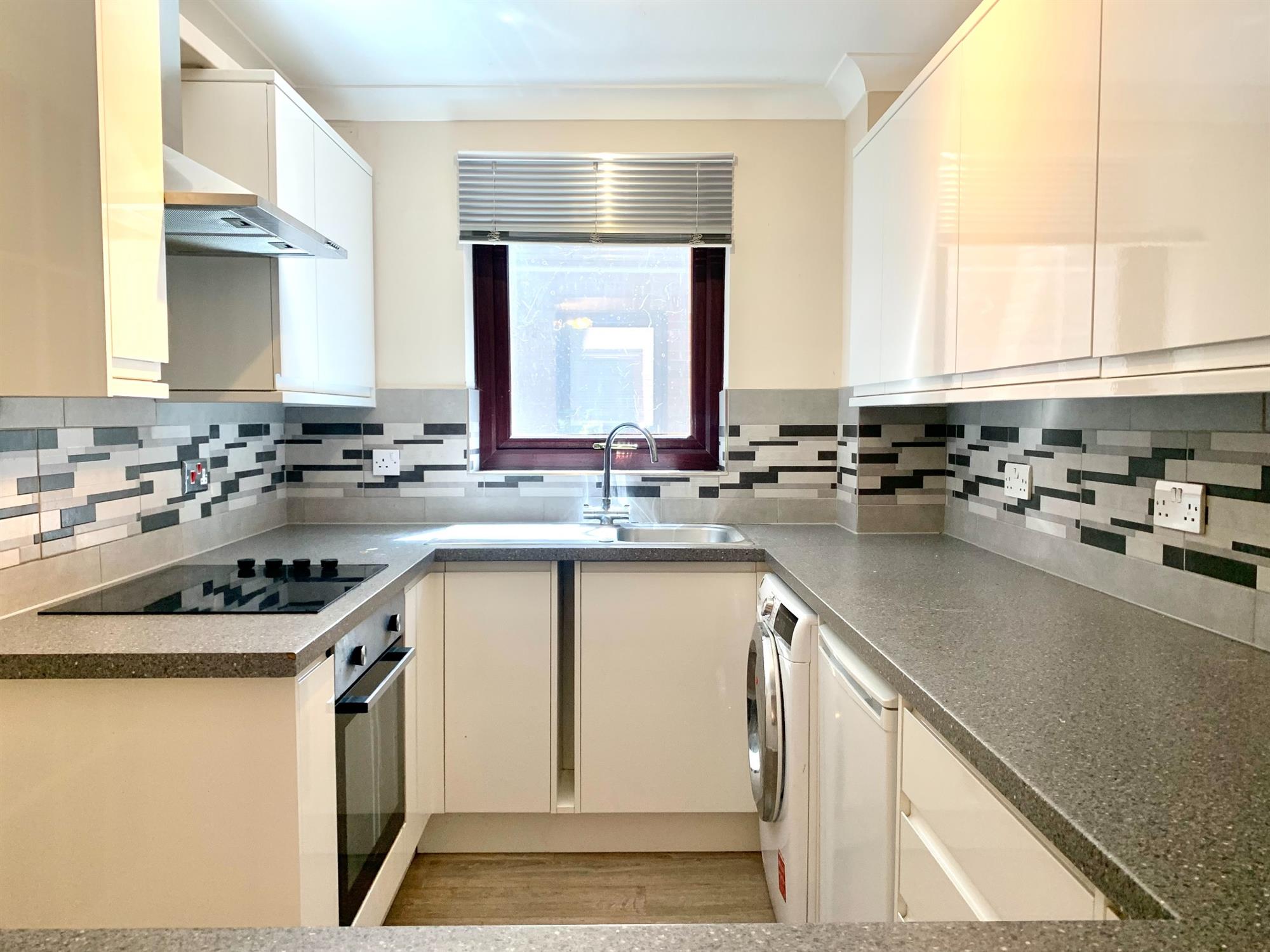 KITCHEN – Modern kitchen with various wall and base units and window. Appliances consisting of electric oven, electric hob, washer/dryer and undercounter fridge with small freezer box.