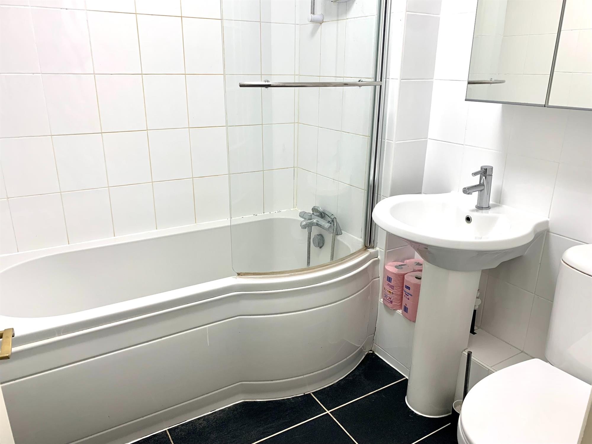 BATHROOM - White suite bathroom with shower over bath, sink and toilet.
