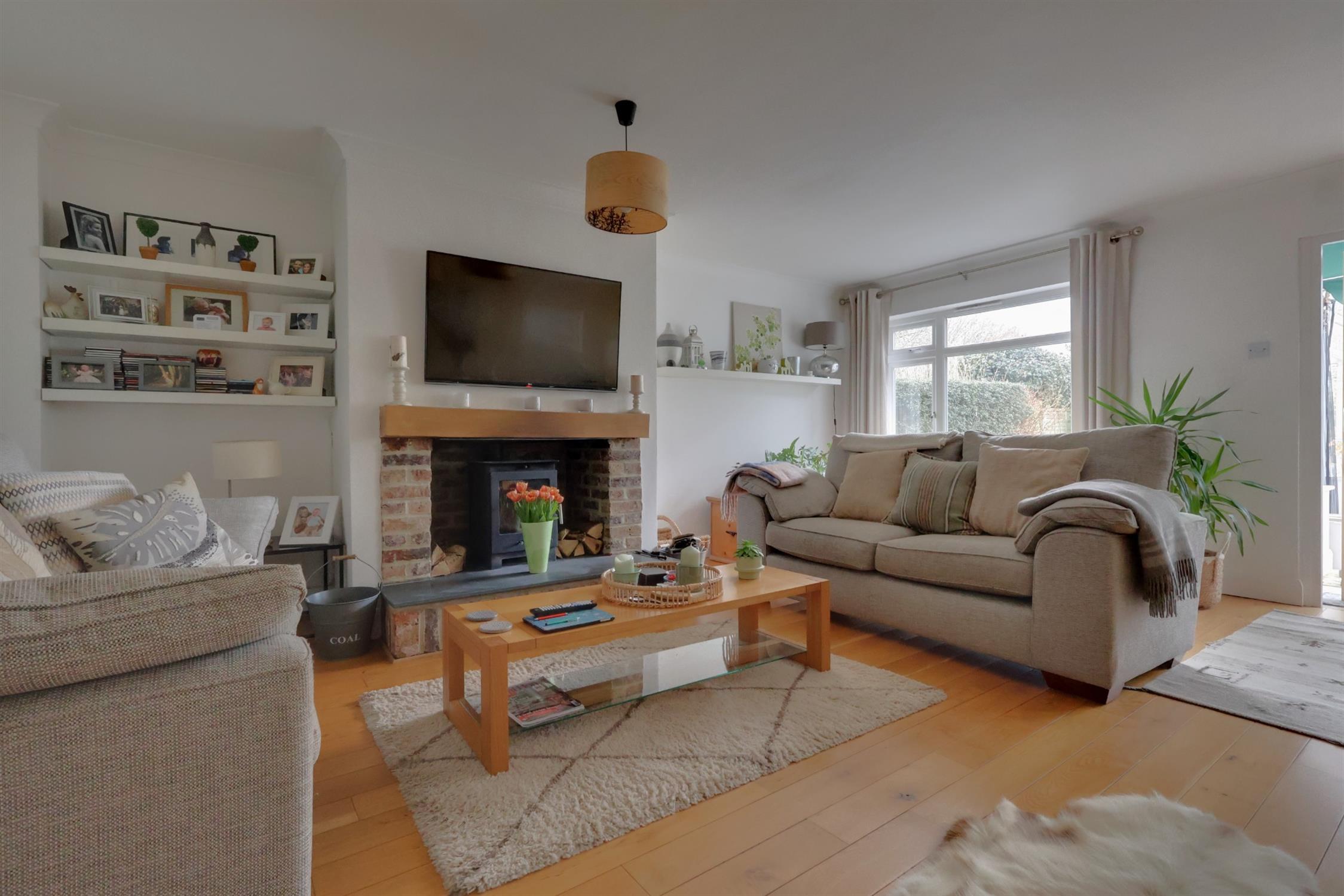 Double-glazed window to the rear elevation, a feature fireplace housing a wood burner, two radiators, oak flooring, and bi-fold doors leading to the conservatory.