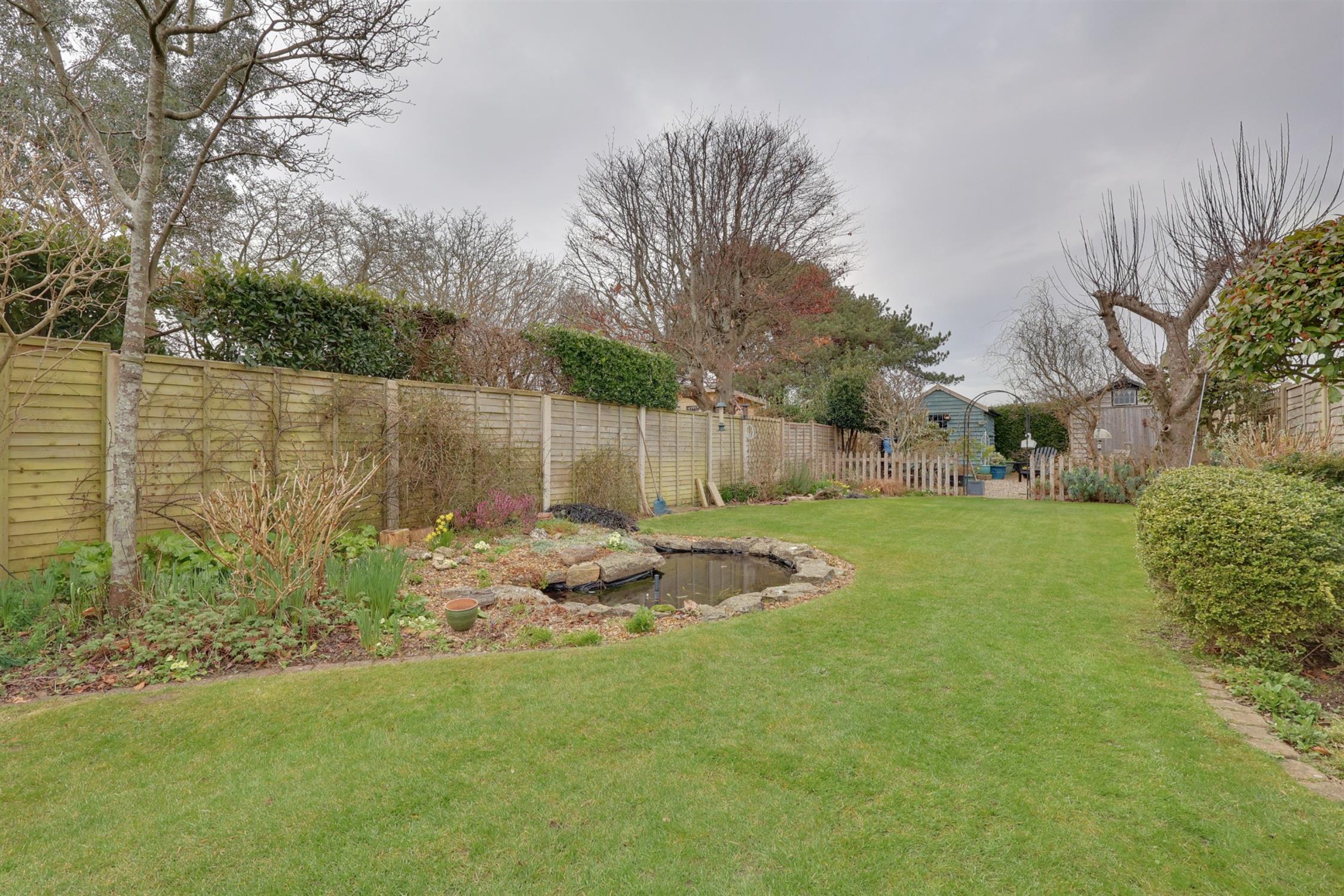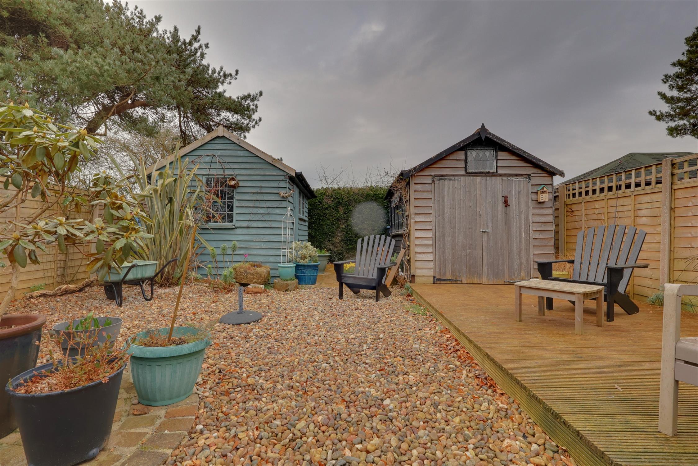 The rear garden is enclosed with fencing and features a patio, lawn, decorative pond, two sheds, mature shrubs, and borders. Additional features include a wood store, outside power points, and side access.