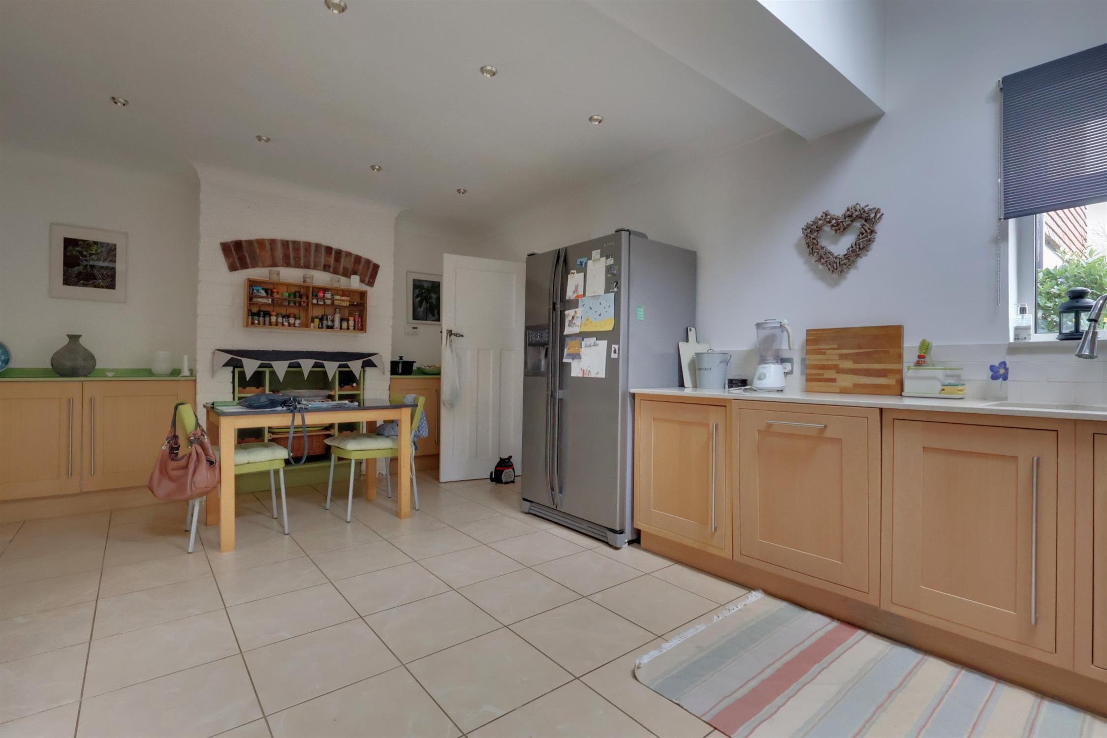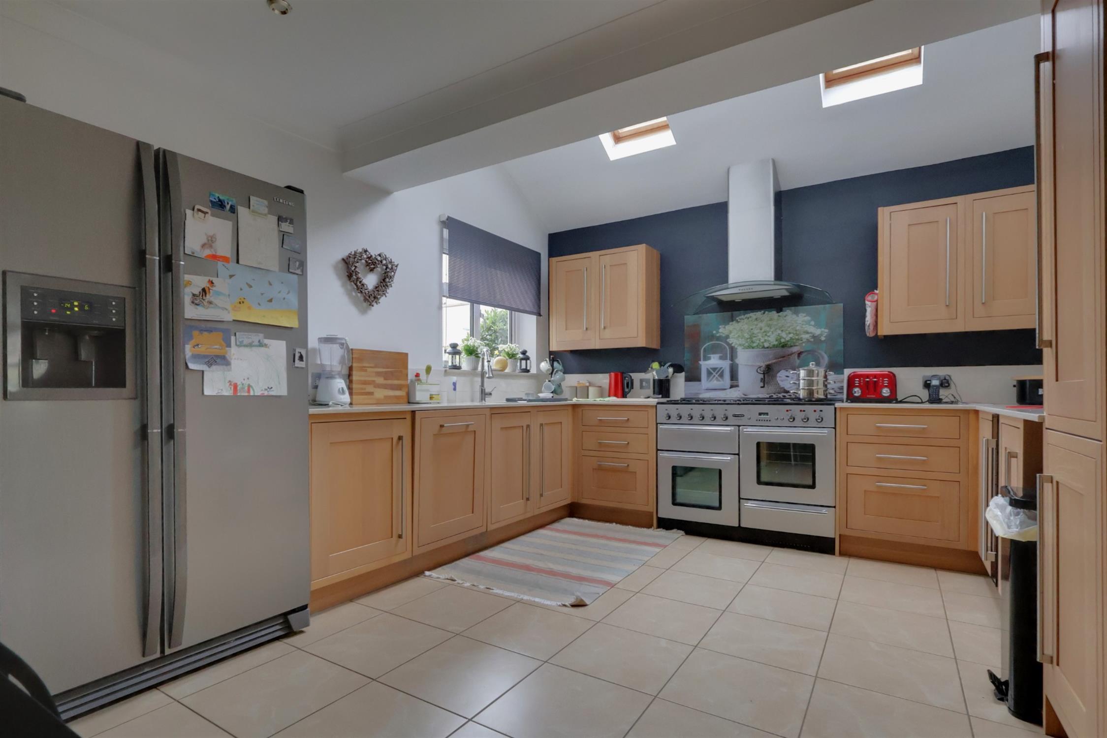 Double-glazed window to the front elevation and a range of wall and base units with a hard-top work surface, incorporating a one-and-a-half sink with a mixer tap. There is space for a range-style master cooker and a fridge-freezer, along with an integral dishwasher. The kitchen also has part-tiled walls, a tiled floor, a vertical radiator, and a wine cooler.