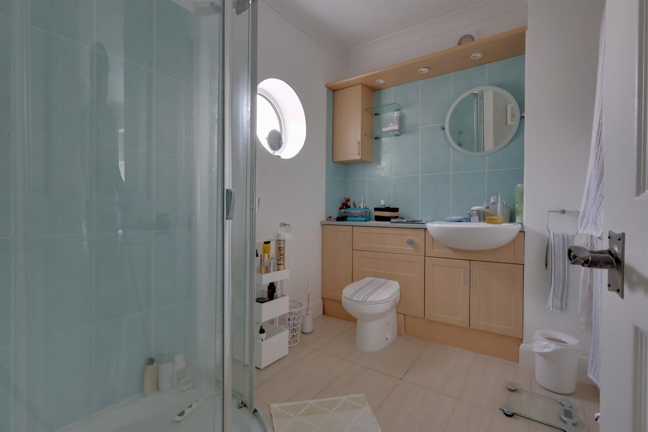 Comprises a three-piece suite with a panel bath and shower over, a wall-mounted sink with a mixer tap, a low-level WC, a ladder radiator, a tiled floor, and a double-glazed window to the side elevation.