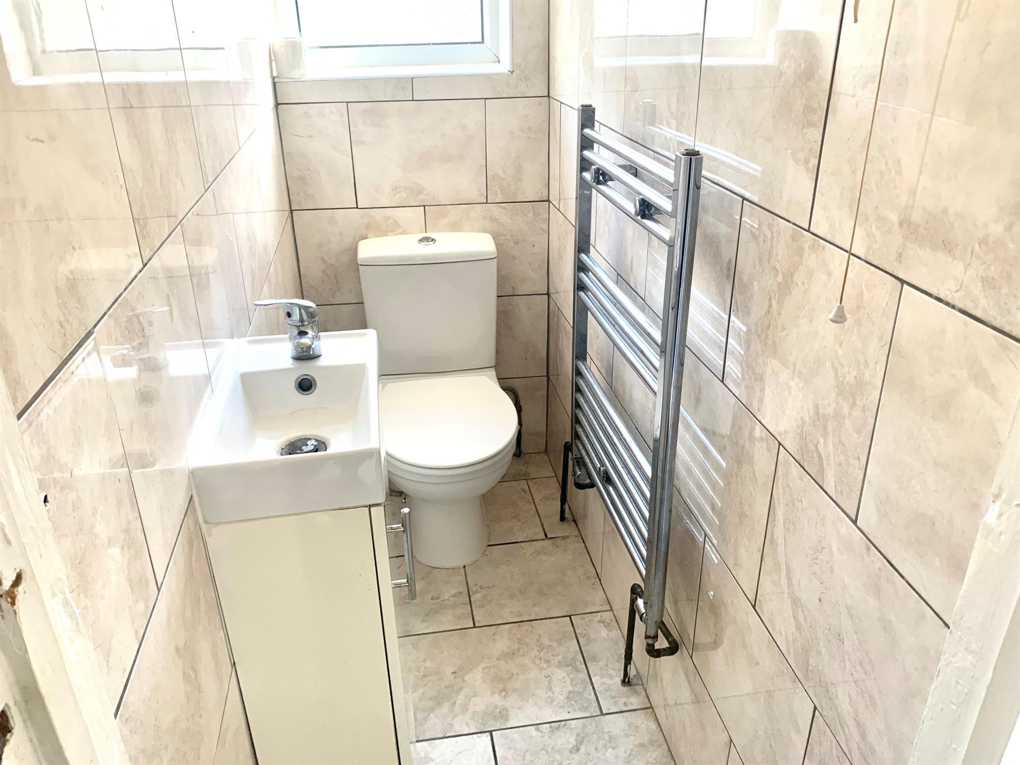CLOAKROOM – White suite with toilet, sink inset in vanity unit and window to rear.