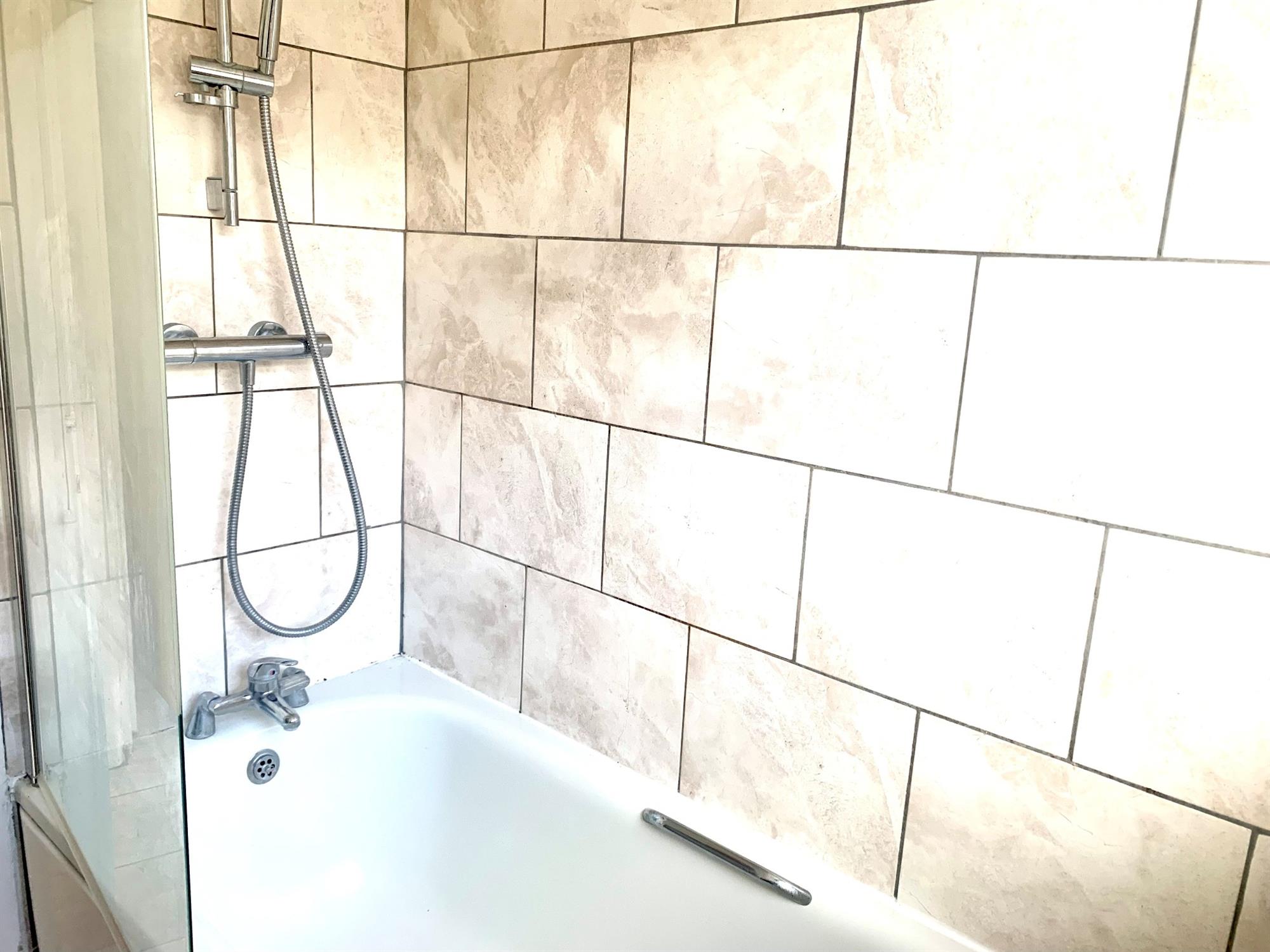 BATHROOM – White suite with bath with shower over, sink with vanity cupboard beneath and window to rear.