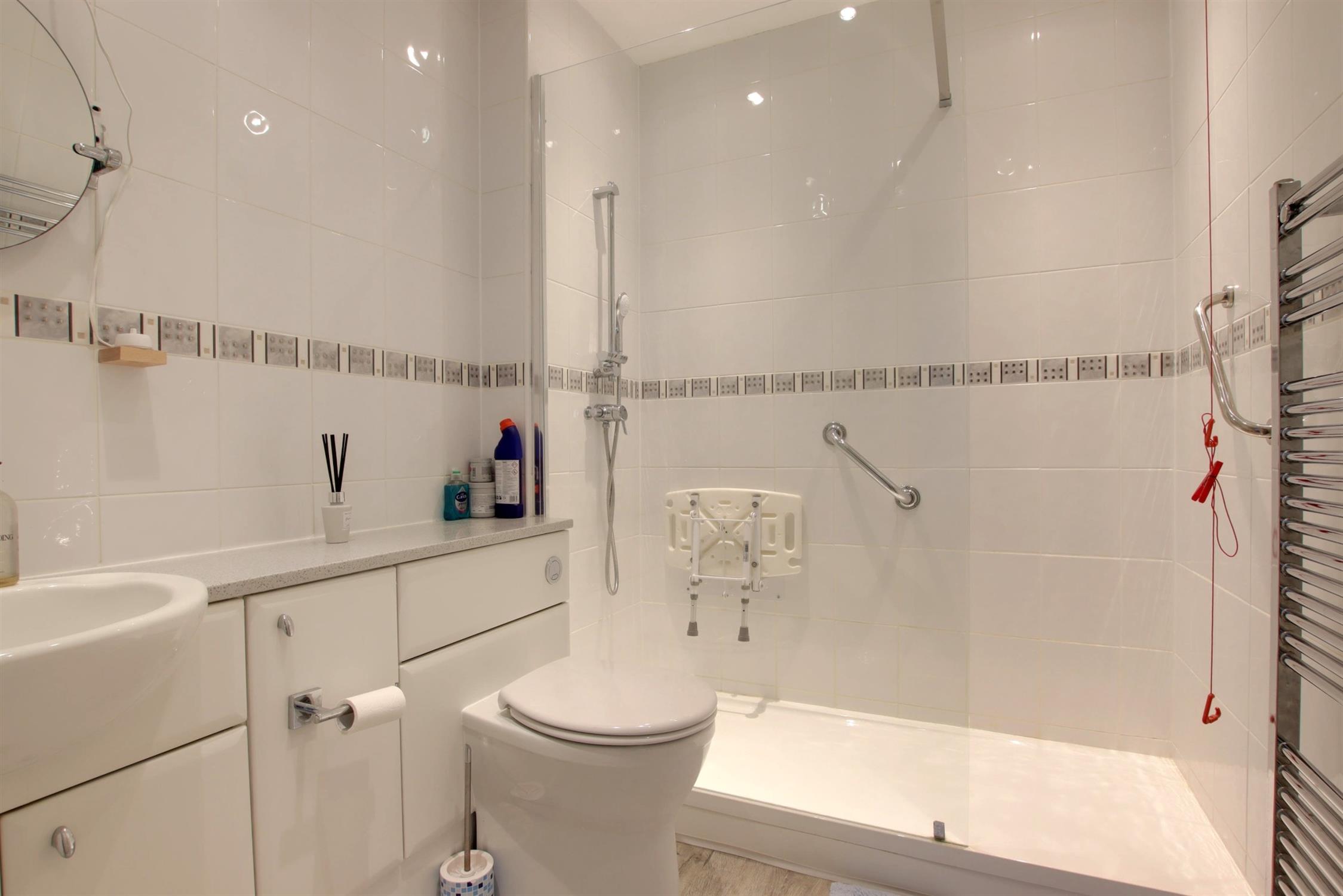 Large walk-in shower with a glass screen. Grip handles and seat. Vanity unit with wash hand basin. Low level WC. Heated towel rail. Tiled walls. Wood effect flooring.