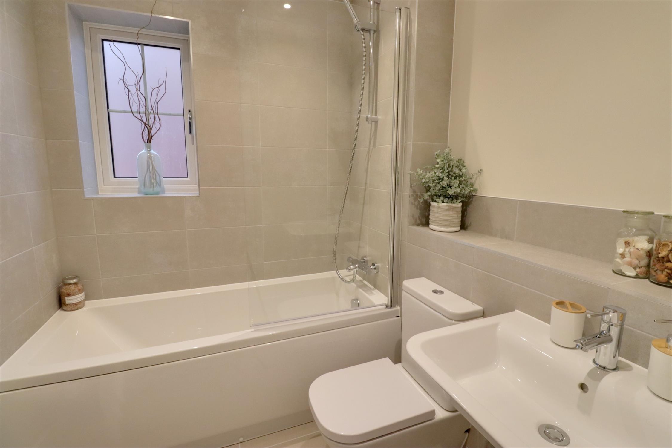 Panel enclosed bath with shower attachment, wall mounted wash basin, low level WC, heated towel rail, side aspect double glazed obscured window, part tiled walls, tiled flooring.