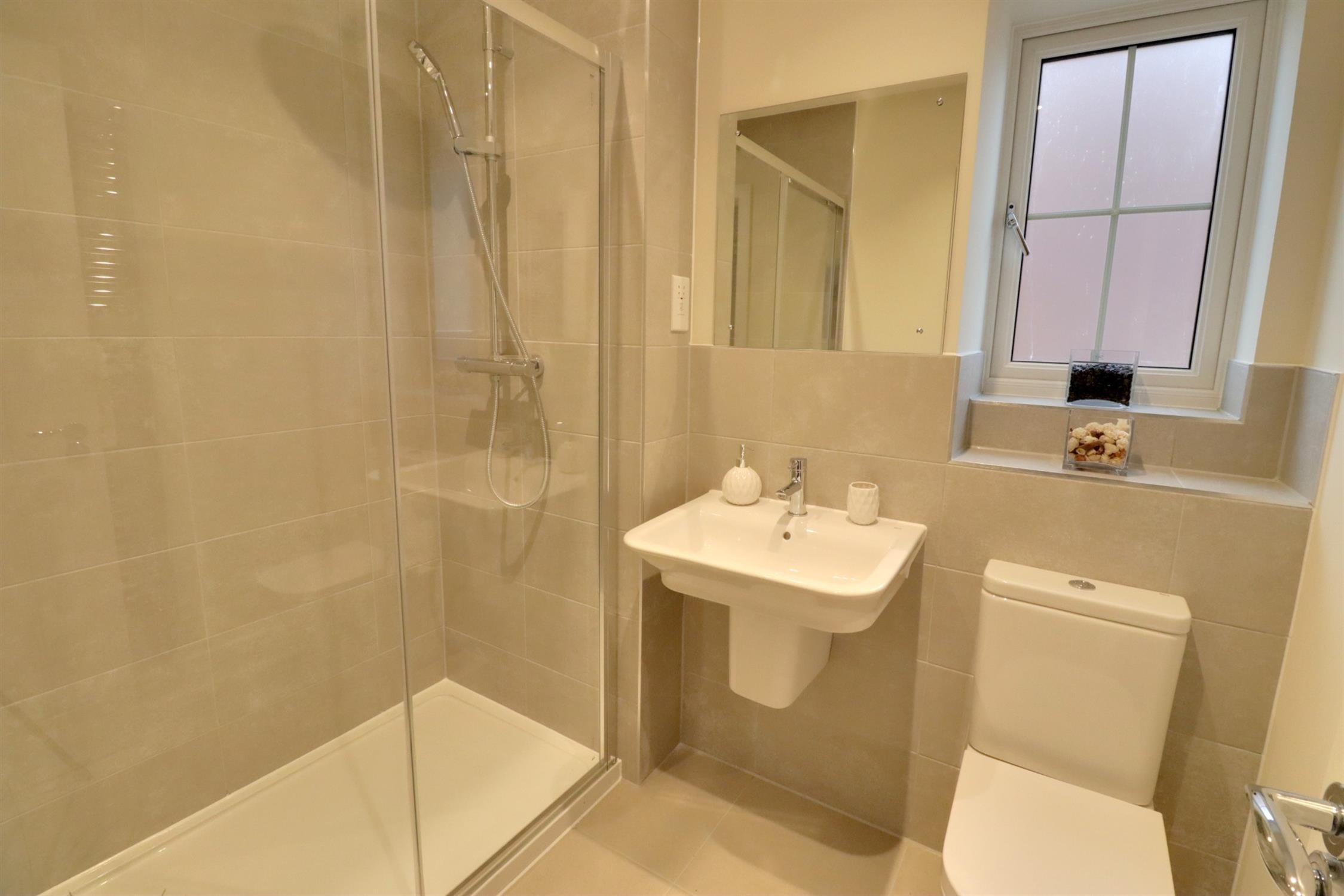 Large shower enclosure with glass door, low level WC, wall mounted wash basin, low level WC, heated towel rail, side aspect double glazed obscured window, part tiled walls tiled flooring.