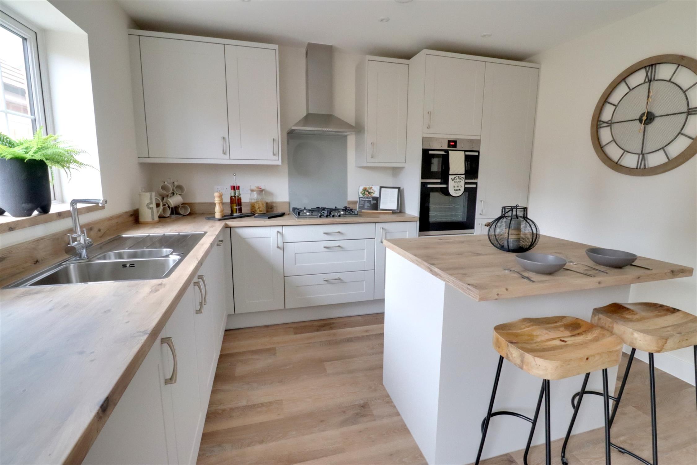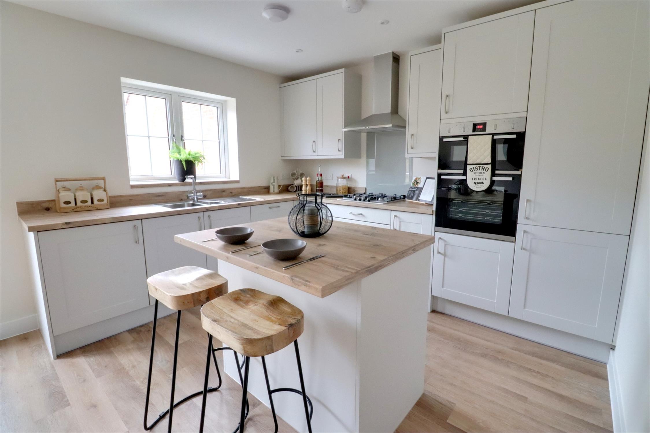 Fitted with a comprehensive range of matching wall and base units with work surfaces over, large island with worksurfaces and breakfast bar, integral NEFF double oven and gas hob with extractor hood over, integral dishwasher and fridge/freezer, inset one and half bowl sink and drainer, rear aspect double glazed window, rear aspect double glazed French doors leading to the garden, 2 radiators, Karndean flooring.