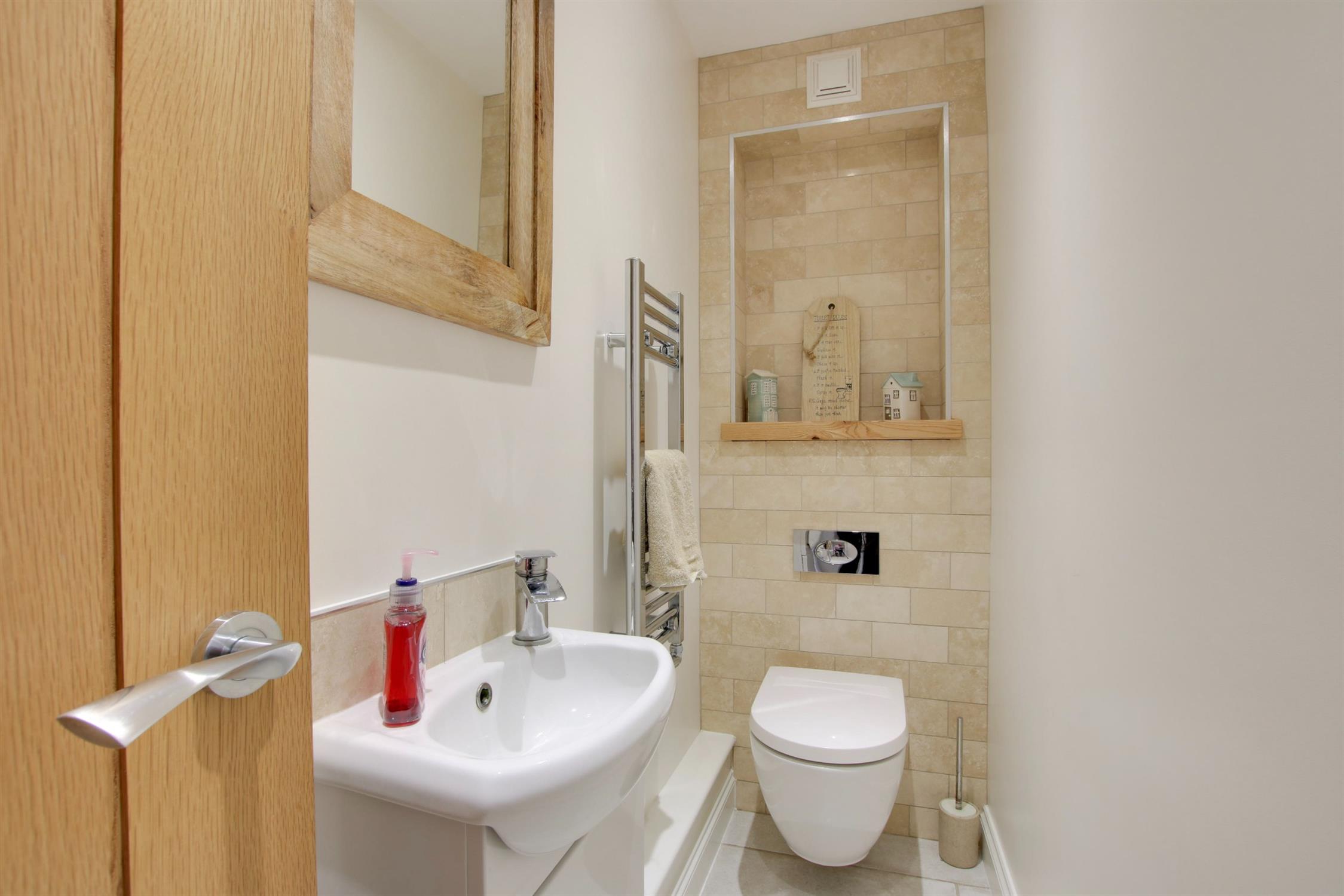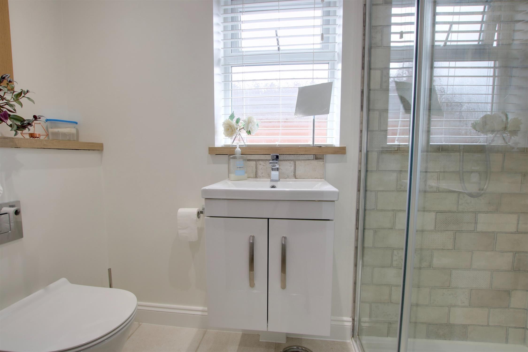 Double glazed window to side elevation. Built-in shower cubicle with fitted shower. Low level WC. Hand basin with cupboard below. Heated towel rail. Porcelain floor tiles.
