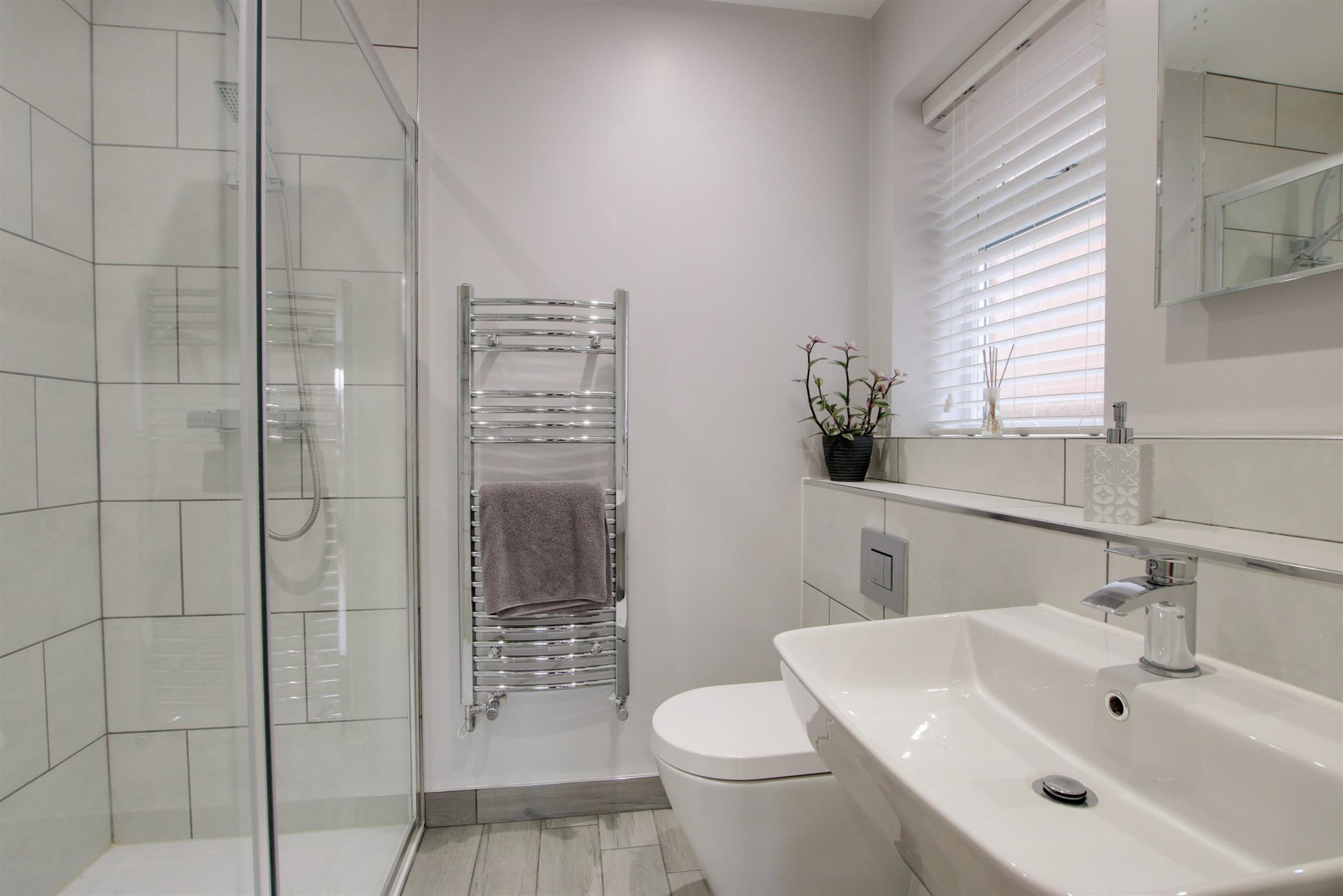 Double glazed window to side elevation. Built-in shower cubicle with fitted shower. Low level WC with concealed cistern. Hand basin. Ceramic wall tiles and porcelain floor tiles. Chrome heated towel rail.
