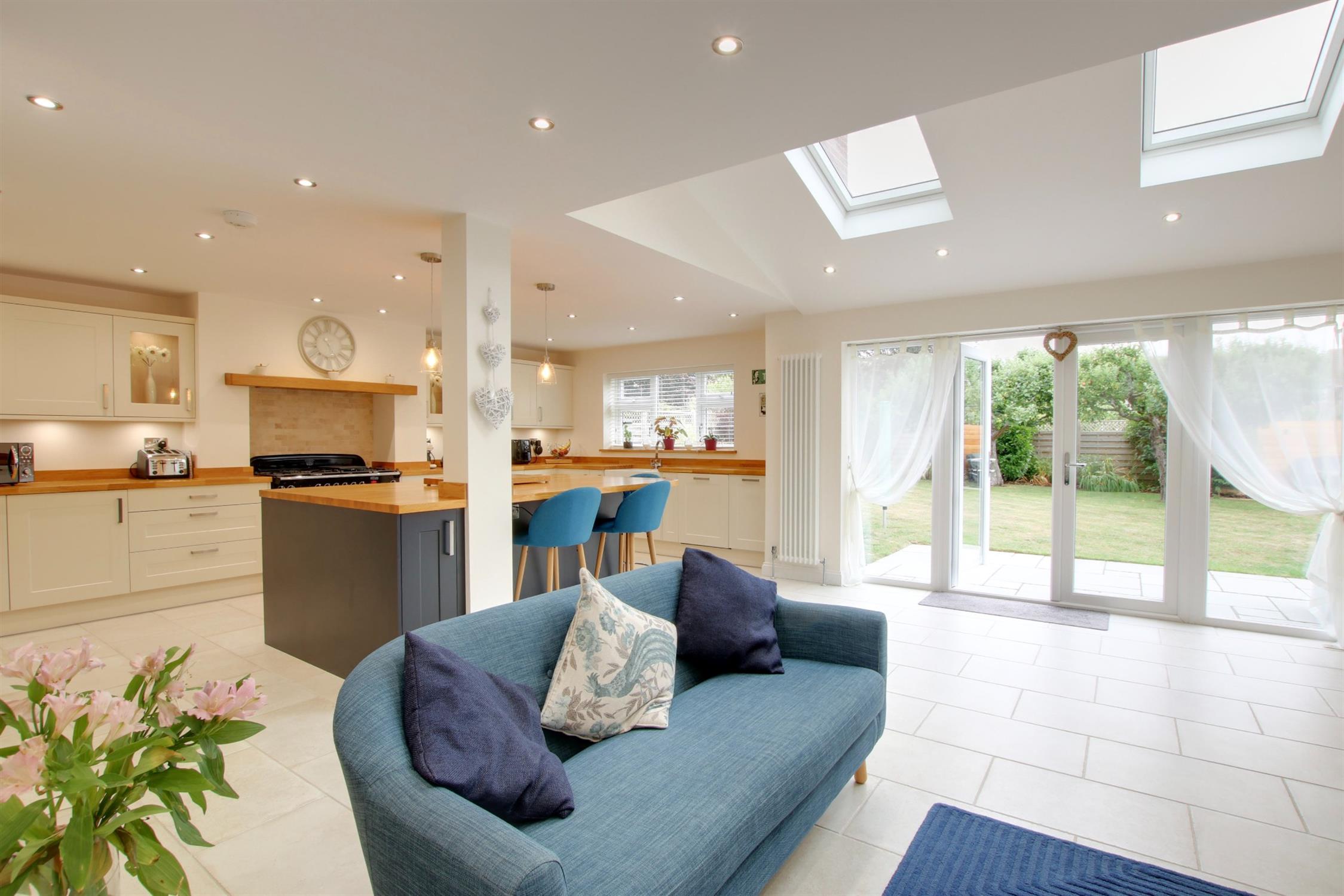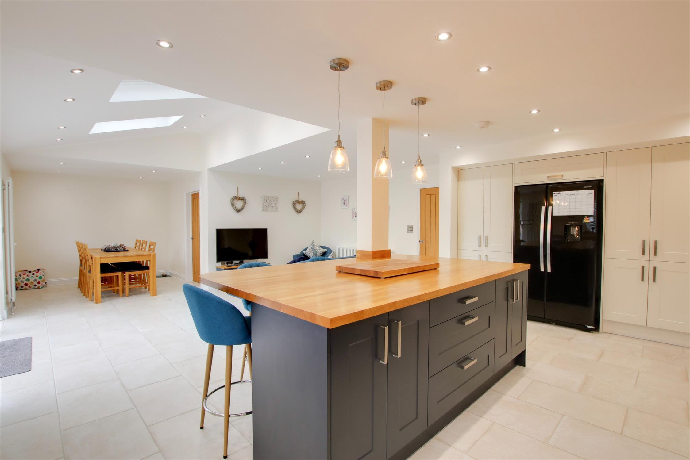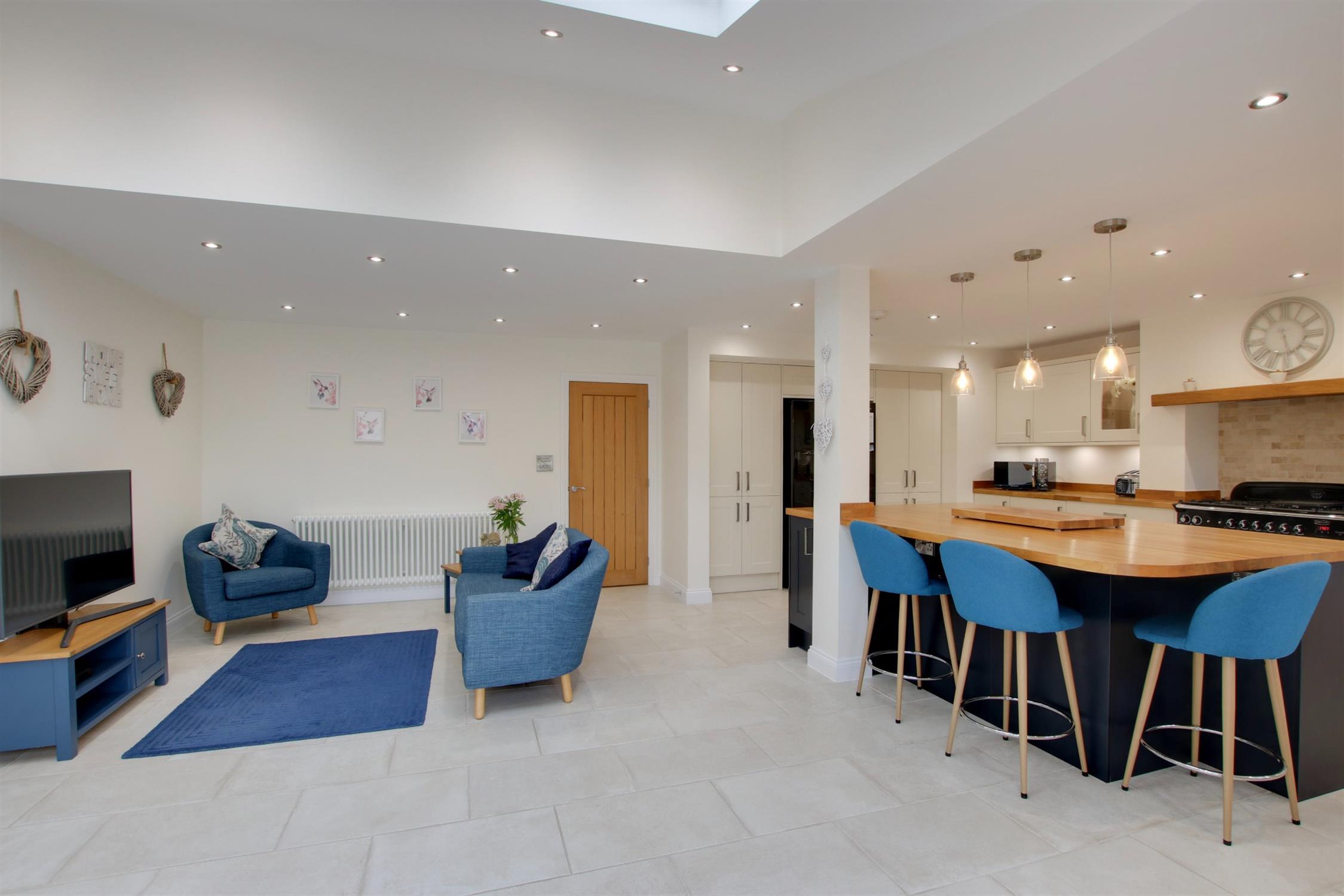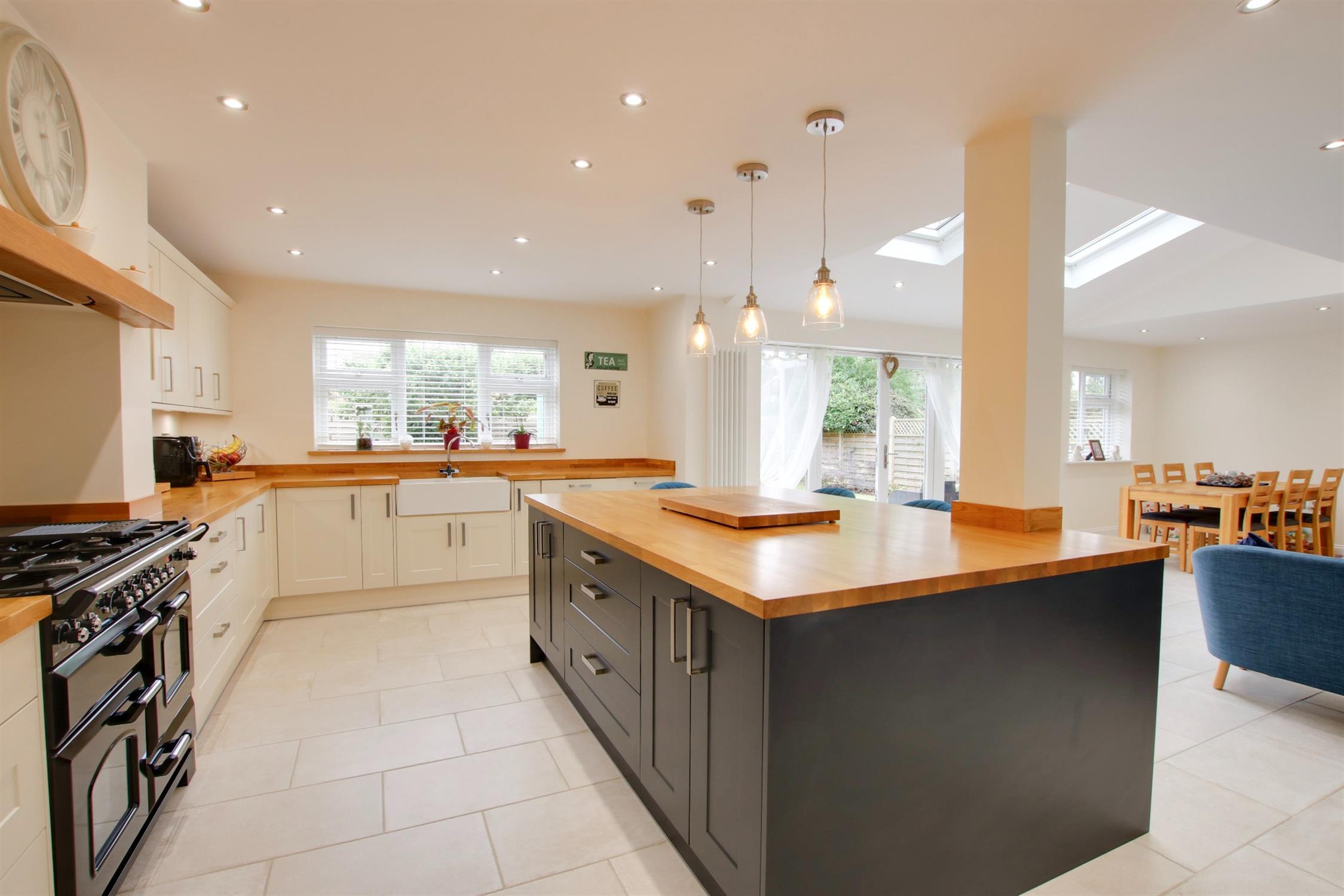 This impressive open plan room has a partially vaulted ceiling and includes a comprehensively fitted shaker style kitchen including; ample base cupboards, drawers and fitted wall units. Large island unit with Oak counter top. Matching Oak worktops with inset double drainer ceramic sink unit with mixer tap. Double glazed window to rear elevation and double glazed French doors opening onto the rear garden. Three column radiators. Two ‘Velux’ roof windows. Integrated dishwasher and integrated refuse bins. Porcelain floor tiles. Space for range style cooker and American style fridge/freezer.