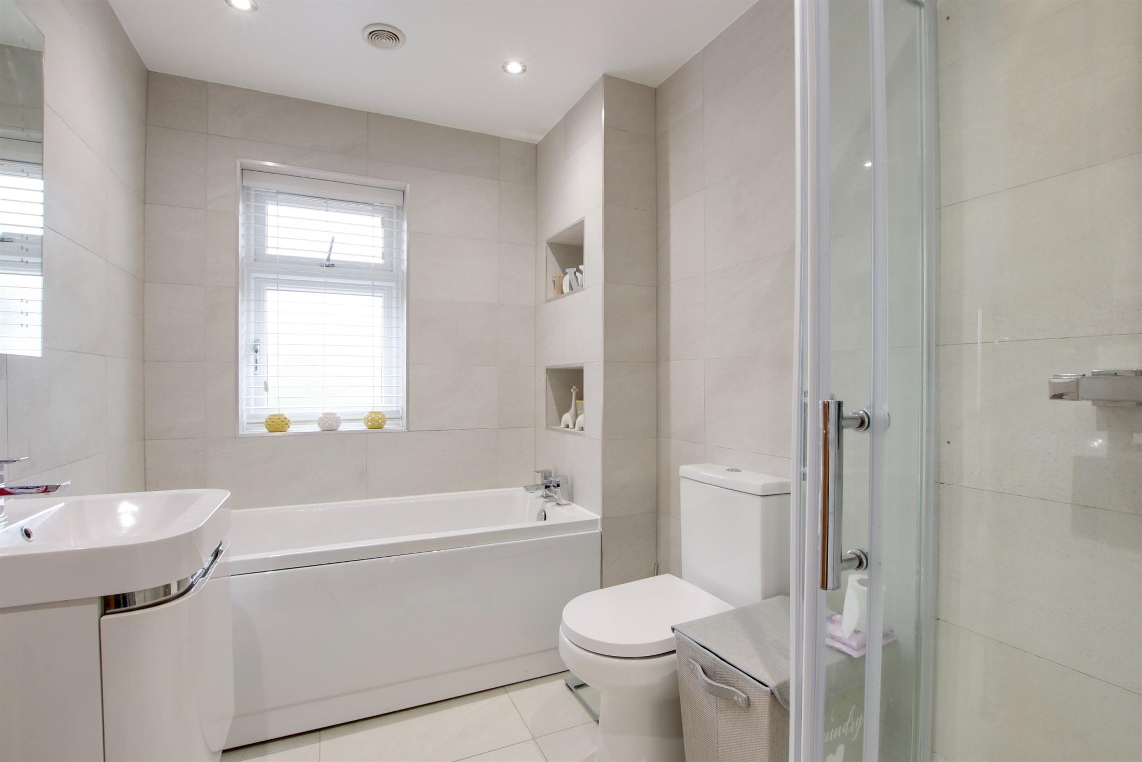 Double glazed window to rear elevation. Four piece suite of panelled bath. Low level WC. Hand basin and built-in shower cubicle. Porcelain tiles to floor and walls. Chrome heated towel rail. Demisting wall mirror incorporating lighting.