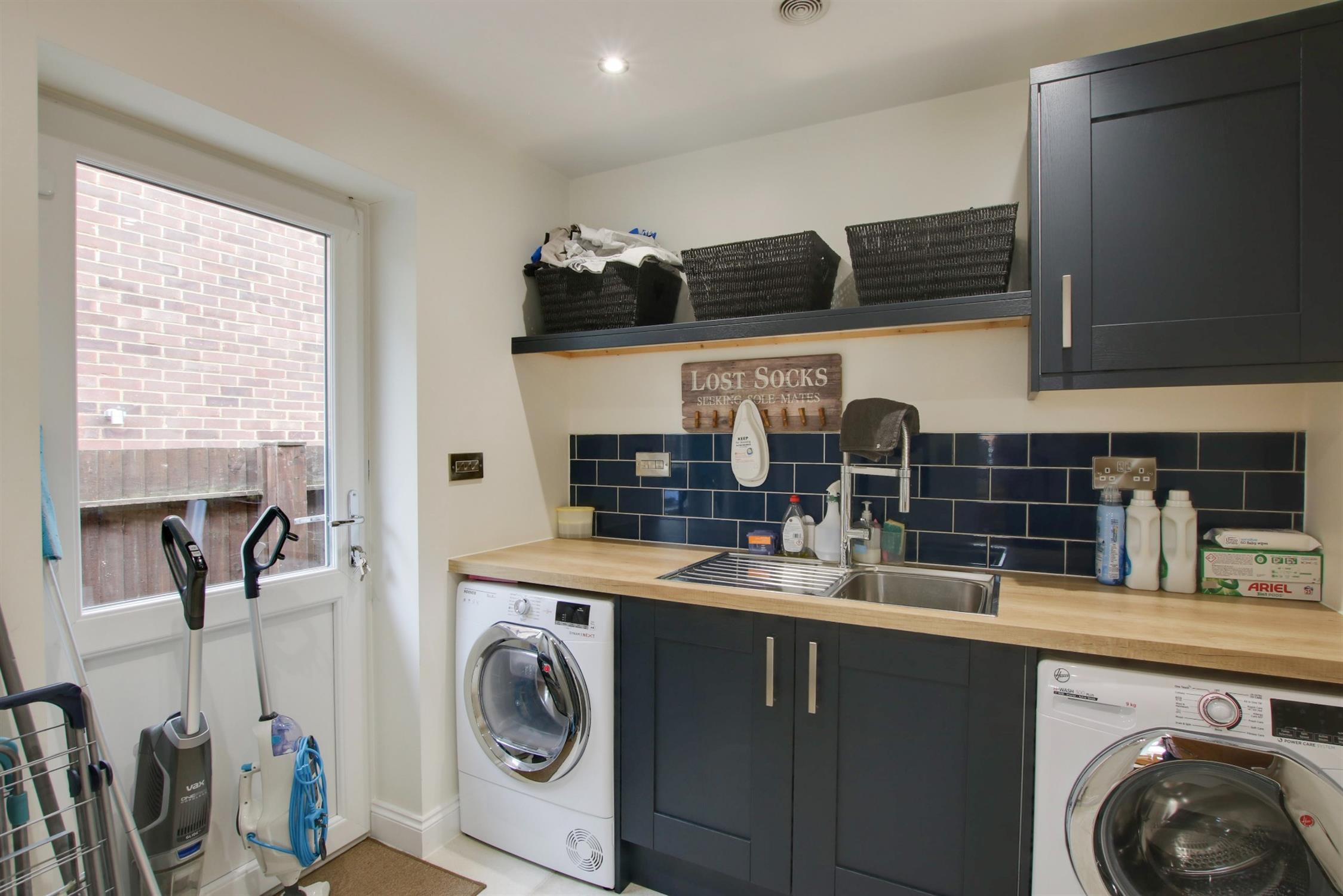Double glazed side door. Porcelain floor tiles. Inset single drainer sink unit. Space for washing machine and tumble dryer. Radiator.