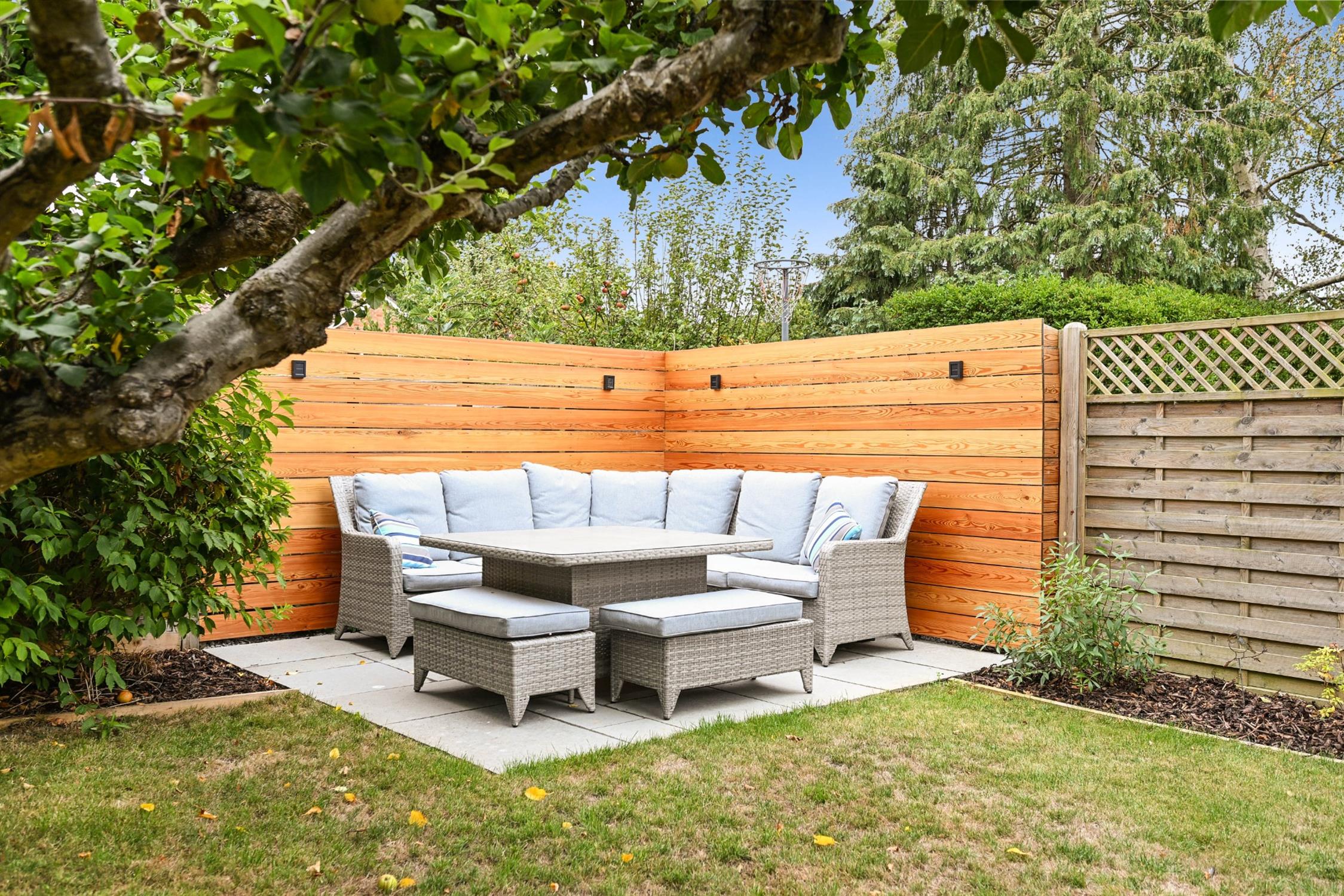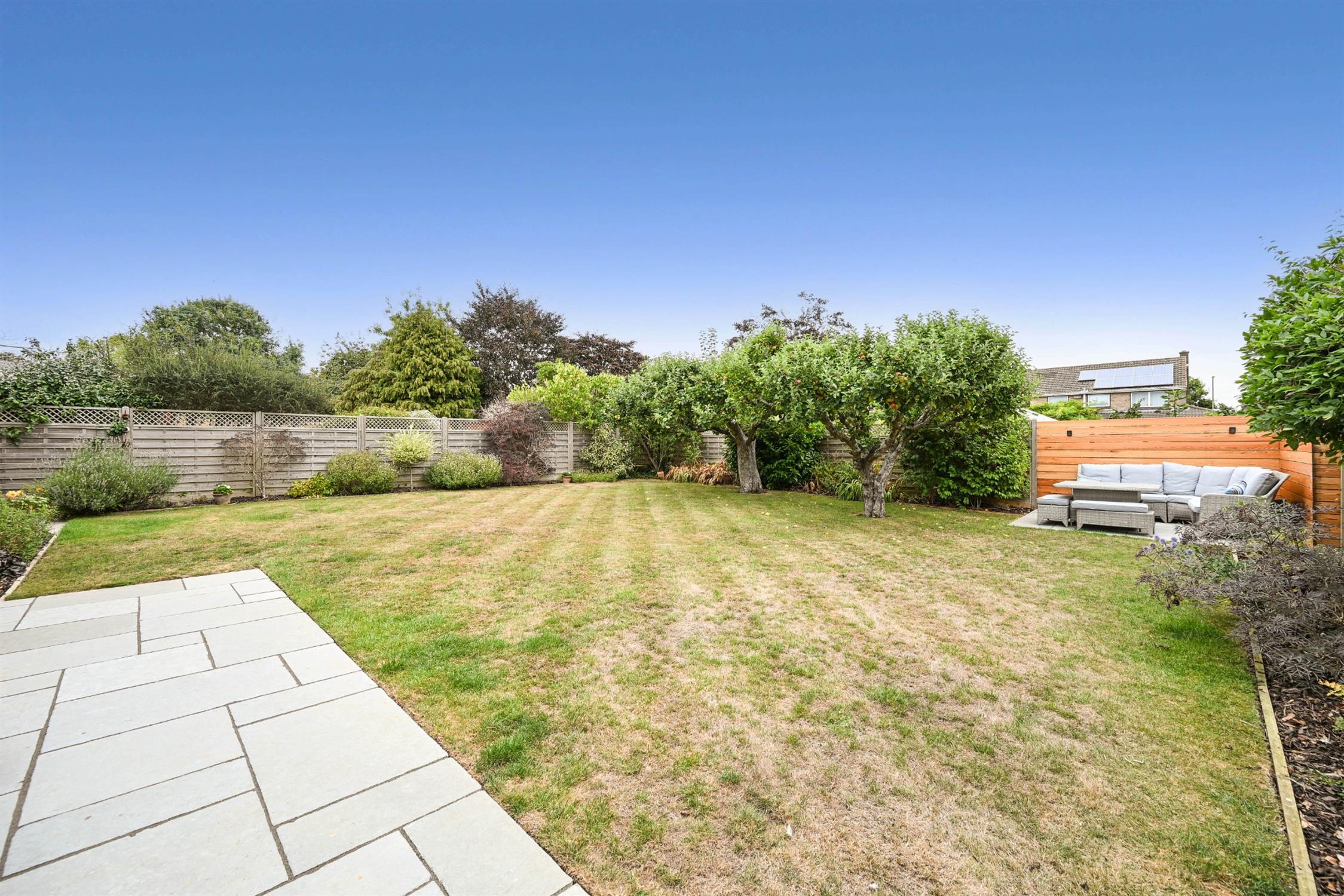 Side access leads to the rear garden, which is a feature of this property being predominantly laid to lawn and including two limestone patios, one immediately behind the property and the other at the bottom of the garden with attractive and contemporary large panelling to two sides. The garden also includes established shrubs and two mature apple trees (one cooker and one eater).
