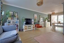 Featuring a double-glazed bow window to the front elevation, laminate flooring, radiator with cover, and double-glazed patio doors opening into the conservatory.