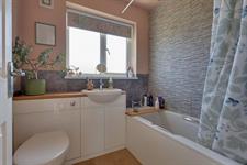 Comprising panel bath with shower over, vanity wash hand basin, low-level WC, ladder radiator, tiled splashbacks, obscured double-glazed window to rear elevation.