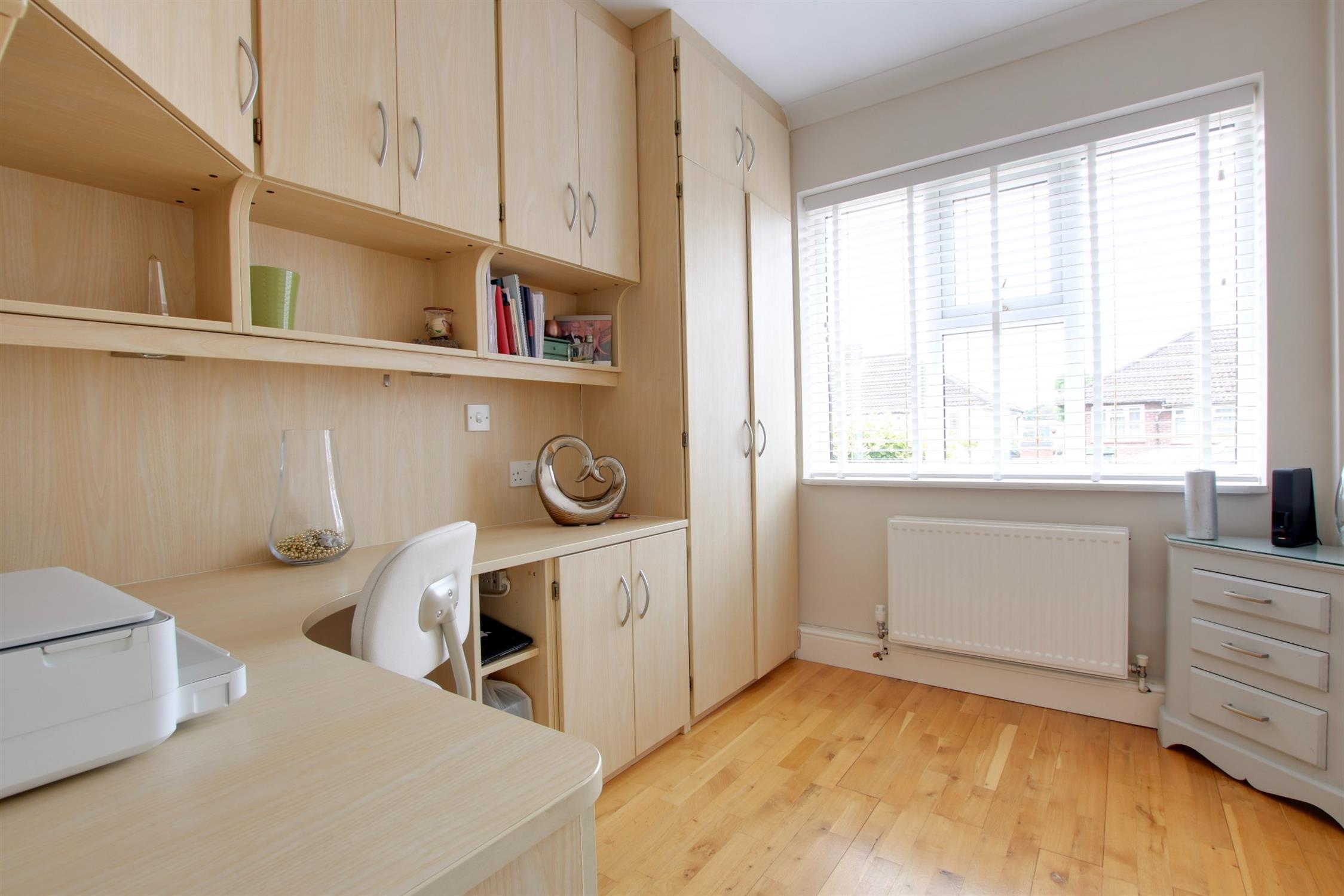 Double glazed window to front elevation. Currently used as a study with a range of fitted study furniture including computer desk, wall-mounted storage units and full-height cupboard. Wooden flooring. Coved and skimmed ceiling.