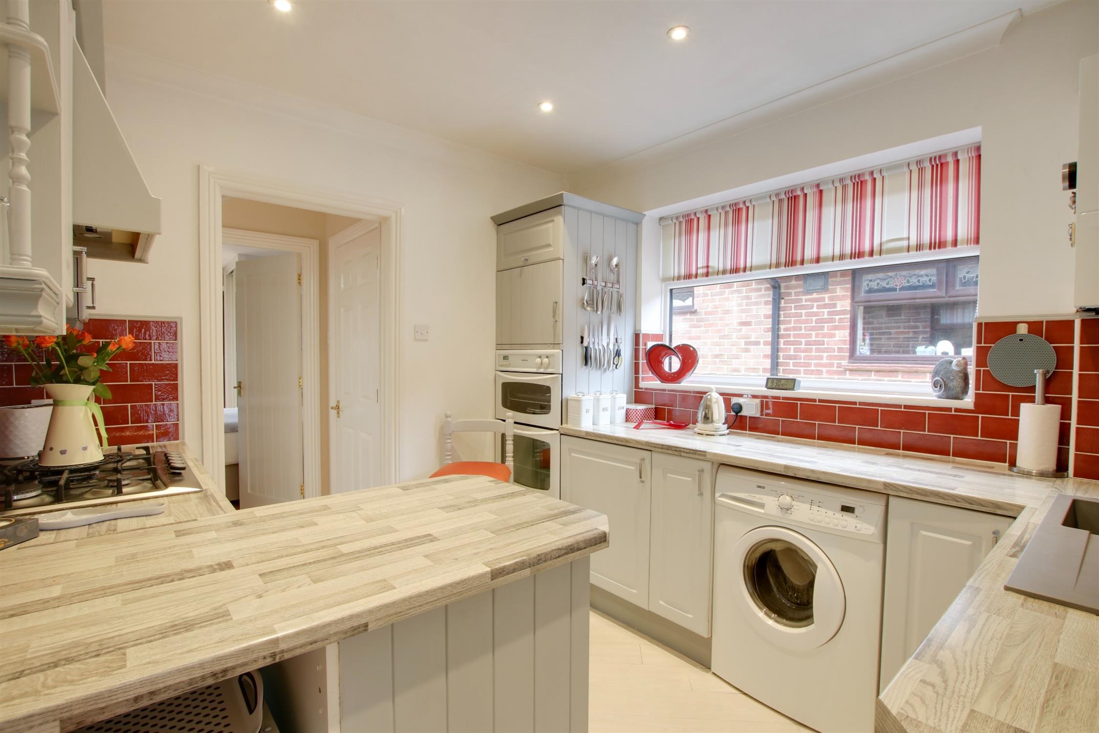 Double glazed window to side elevation. Kitchen comprising stainless steel single drainer sink unit with cupboard under. Further range of wall and base level units with roll edge work surfaces over and splash back tiling. Built-in five ring gas hob with cooker hood over. Built-in double oven and grill with cupboards under and over. Plumbing for washing machine and dishwasher (both to remain). Wall-mounted gas boiler. Inset ceiling spotlights. Coved and skimmed ceiling. Doorway to inner hallway.