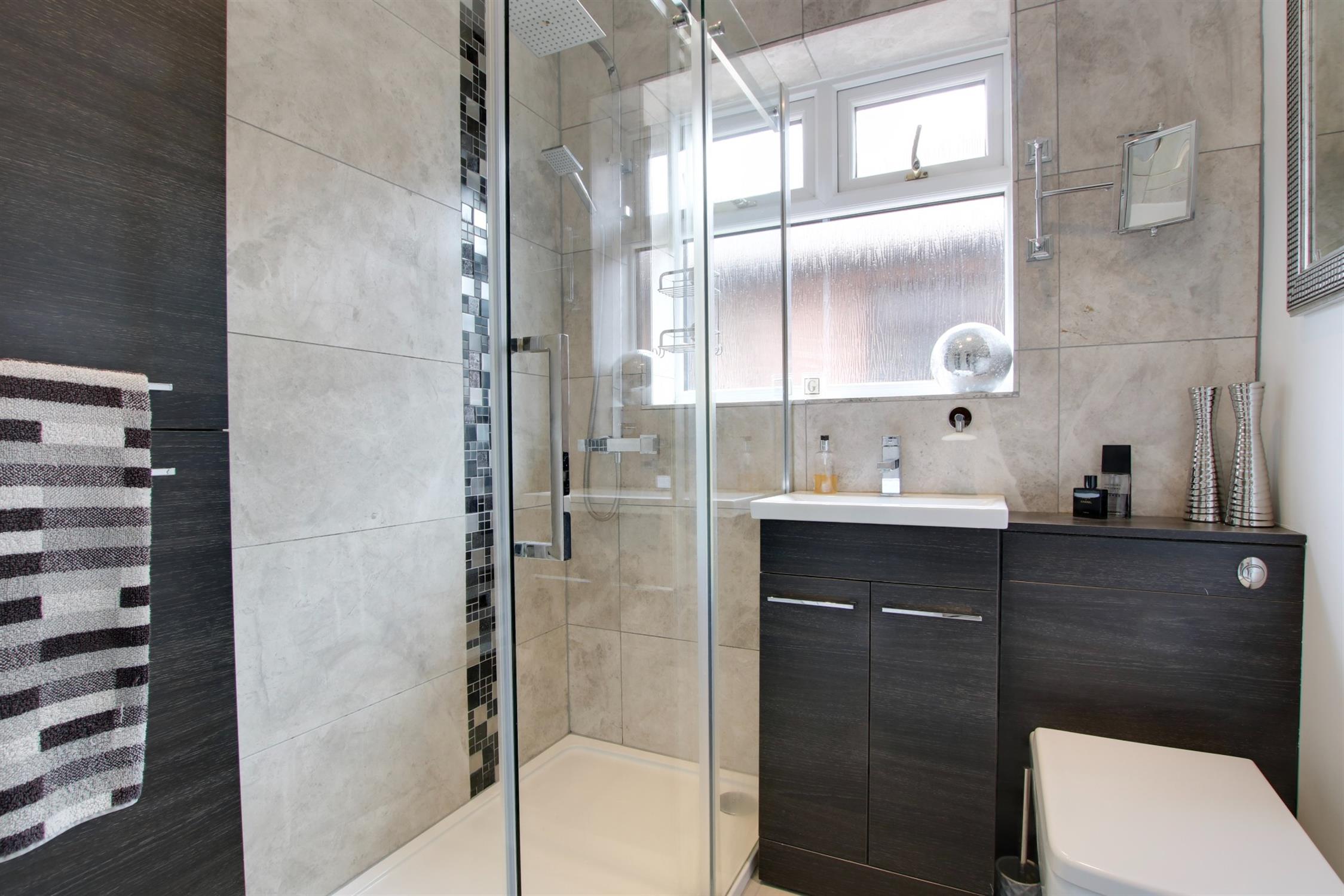 Double glazed window to side elevation. Tiled shower cubicle with monsoon shower head. Vanity unit with wash hand basin and storage beneath. Low level close coupled WC. Heated chrome towel rail. Tiled floor. Part tiled walls. Extractor fan.