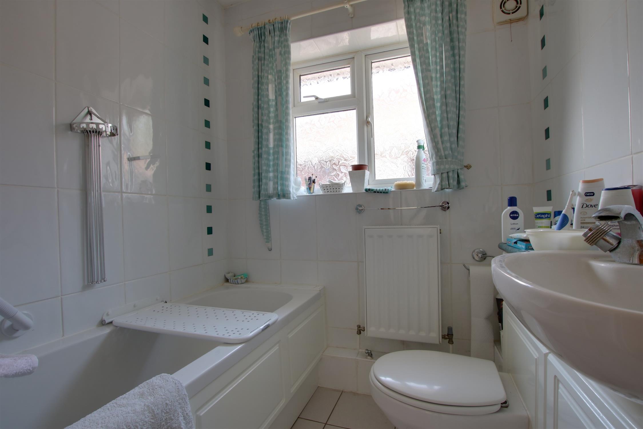 Double glazed window to side elevation. Panel enclosed bath with shower unit and shower attachment over. Vanity unit with wash hand basin and storage beneath. Low level close coupled WC. Tiled flooring and walls. Radiator. Extractor fan,