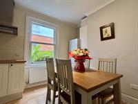Modern fitted kitchen with various wall and base units and wooden flooring. The appliances consist of a brand-new oven and hob, with optional white goods (fridge/freezer, washing machine and dishwasher). A window to the side and a door leading to the side access and garden. Off the kitchen is a cloakroom, housing the boiler.