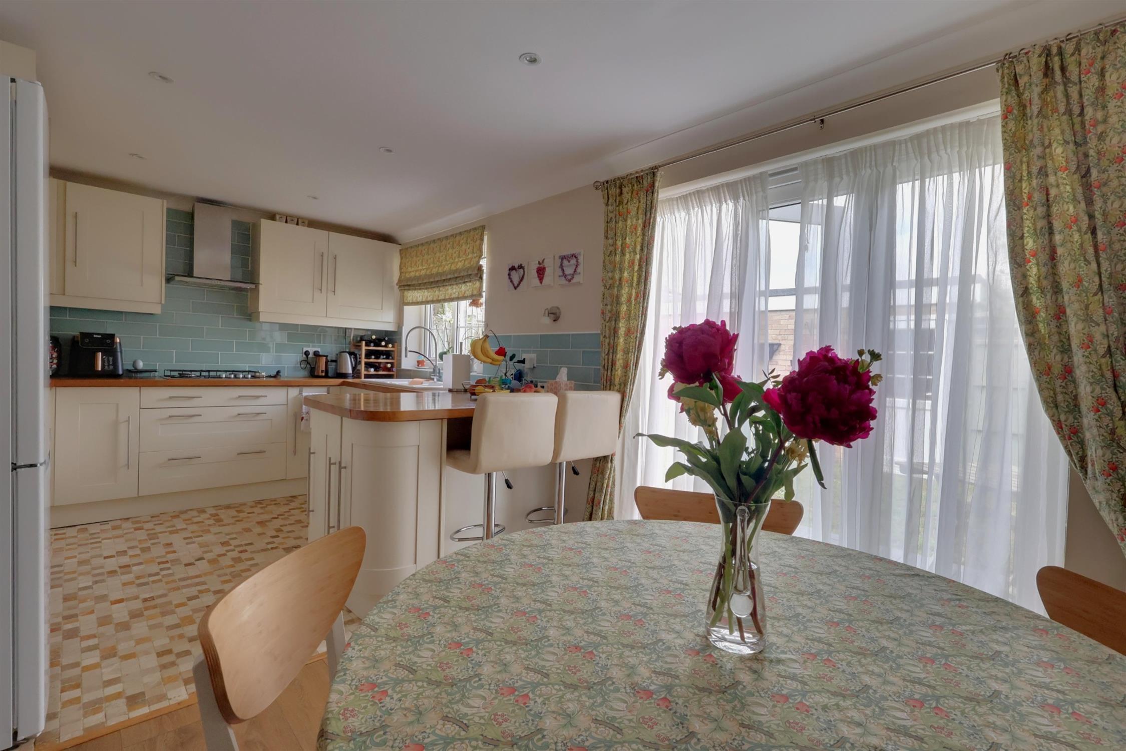 Double-glazed window overlooking the rear garden and bi-folding doors opening directly onto the decking area. It is fitted with a range of wall and base units with work surfaces over, an inset one-and-a-half bowl sink with mixer tap, integrated gas hob with extractor hood above, built-in oven, space for a fridge-freezer, and built-in dishwasher. A breakfast bar offers seating for two.