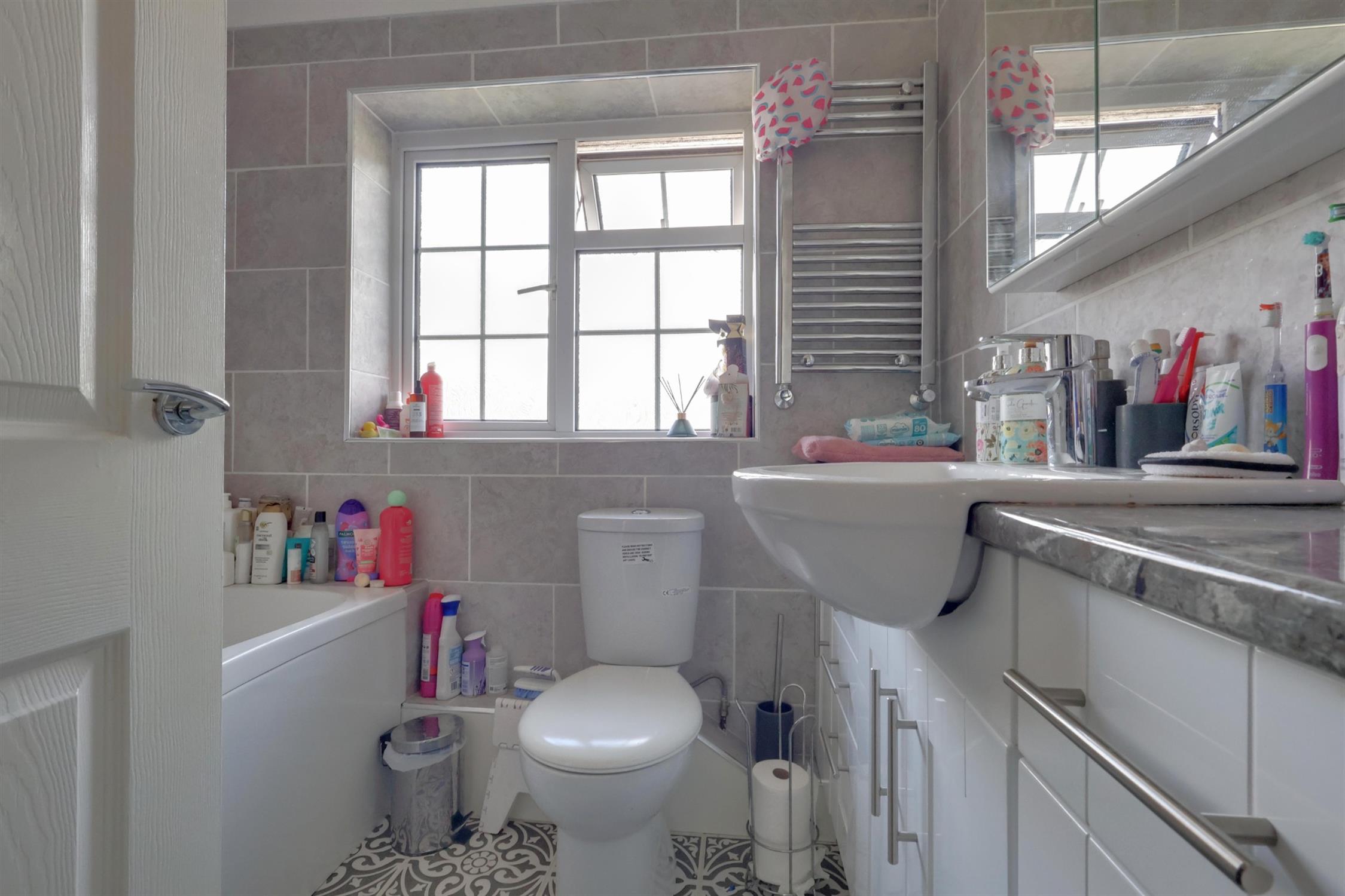Oval, obscure-glazed window to the front elevation, close-coupled WC, vanity wash hand basin, ladder-style radiator, part-tiled walls, and extractor fan.