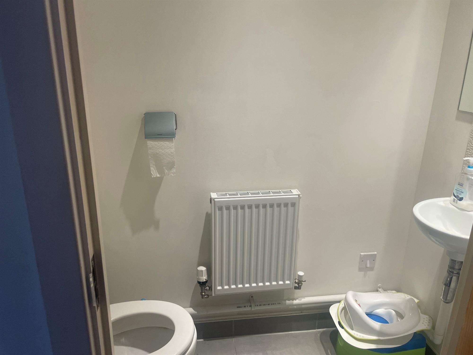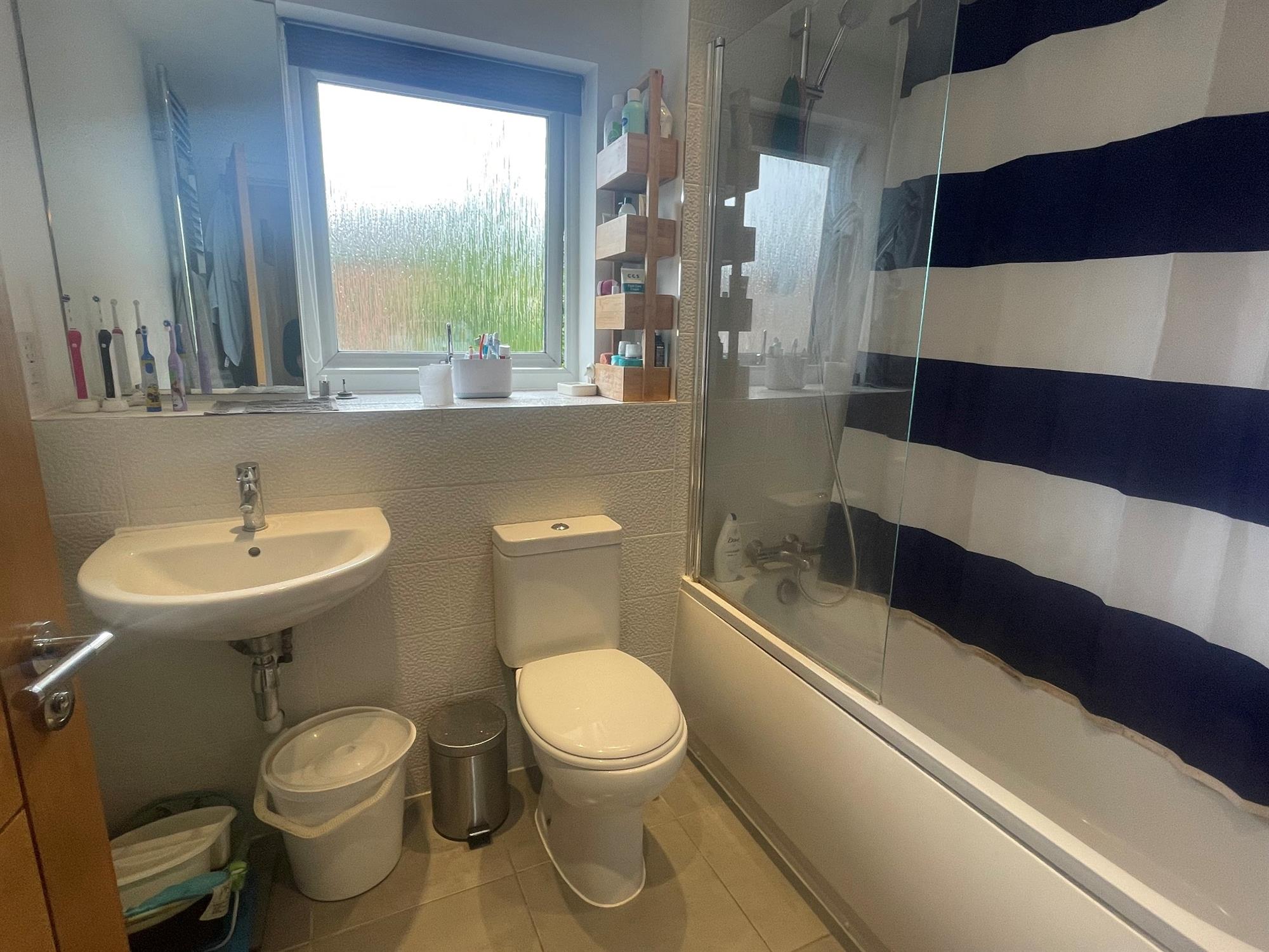BATHROOM - Family white suite bathroom with shower over the bath.