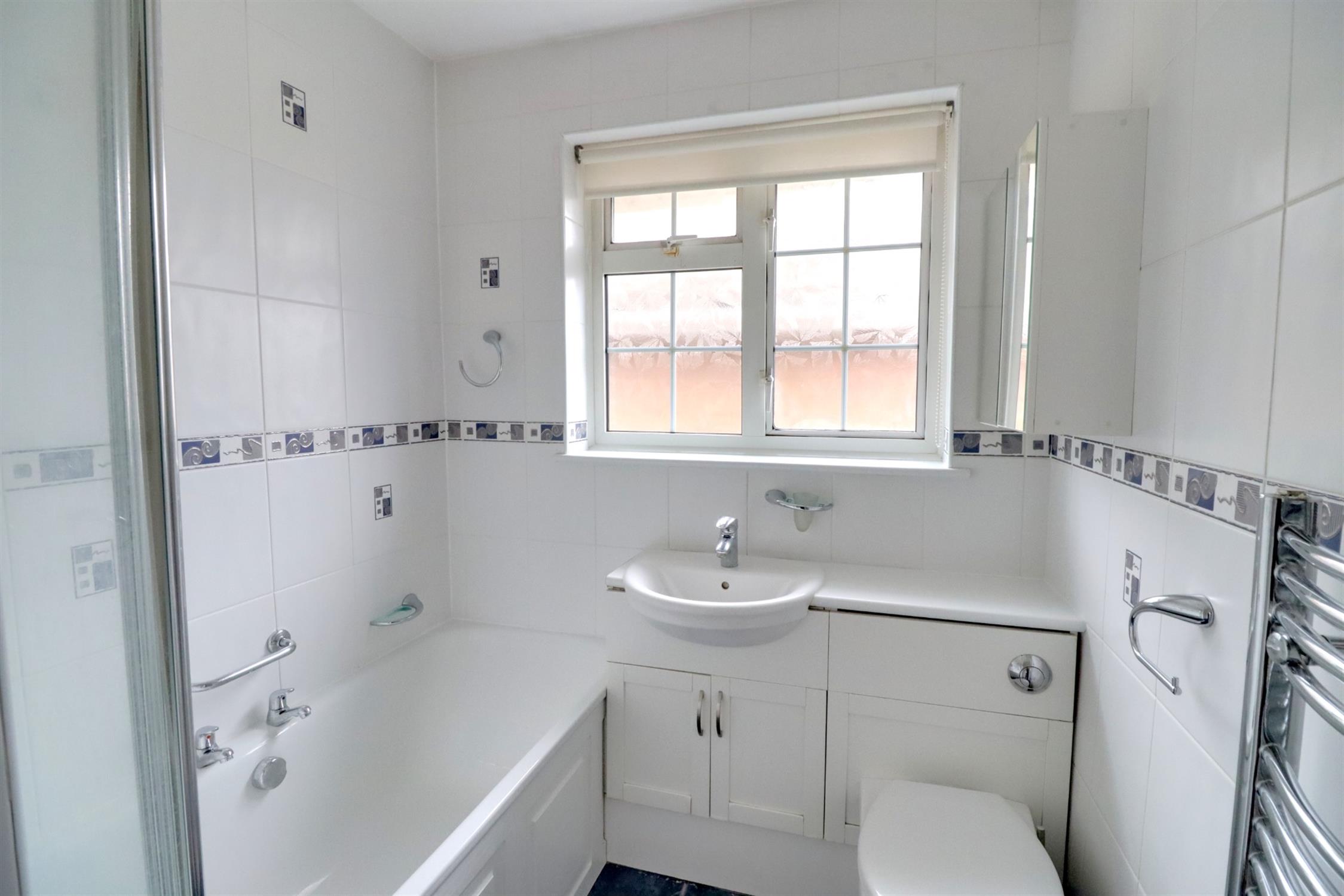 Panel enclosed bath with shower over, concealed flush WC and vanity unit, heated towel rail, side aspect double glazed window, built-in cupboard housing the hot water cylinder, fully tiled walls.
