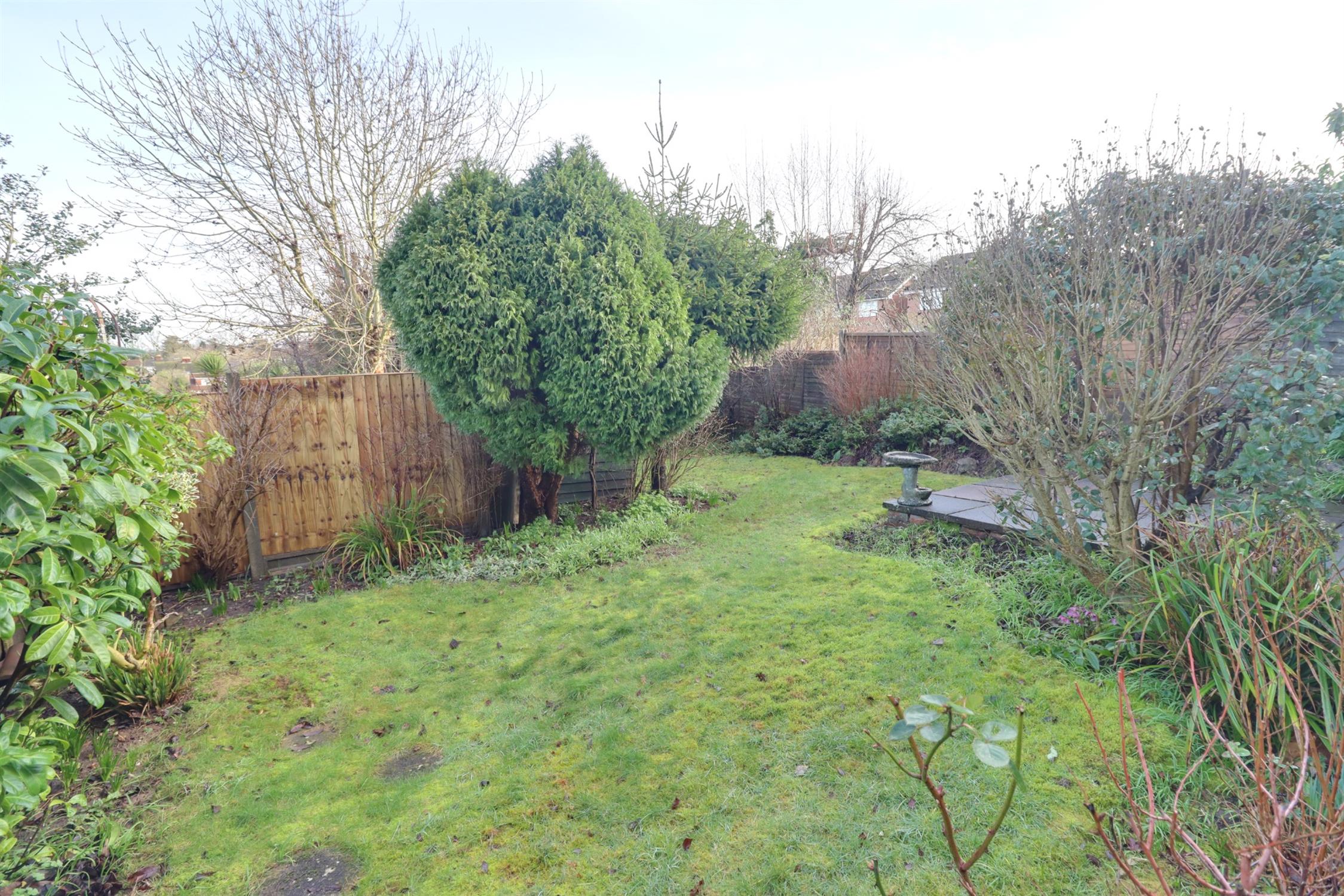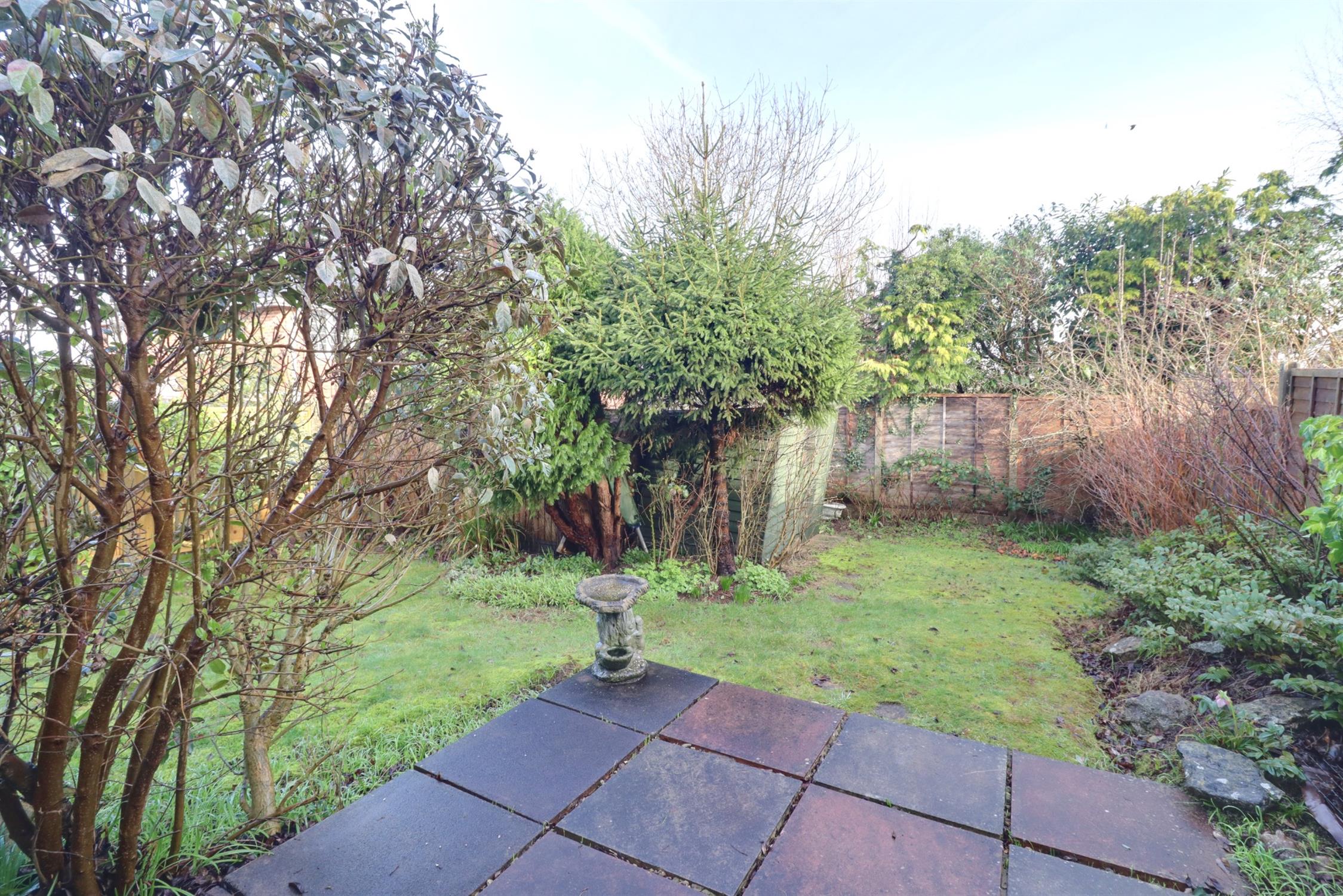 Well maintained outside space with a raised patio. Steps leading to a paved area and lawn with shrub borders, outside tap, pond and wooden shed, enclosed by fence.