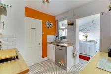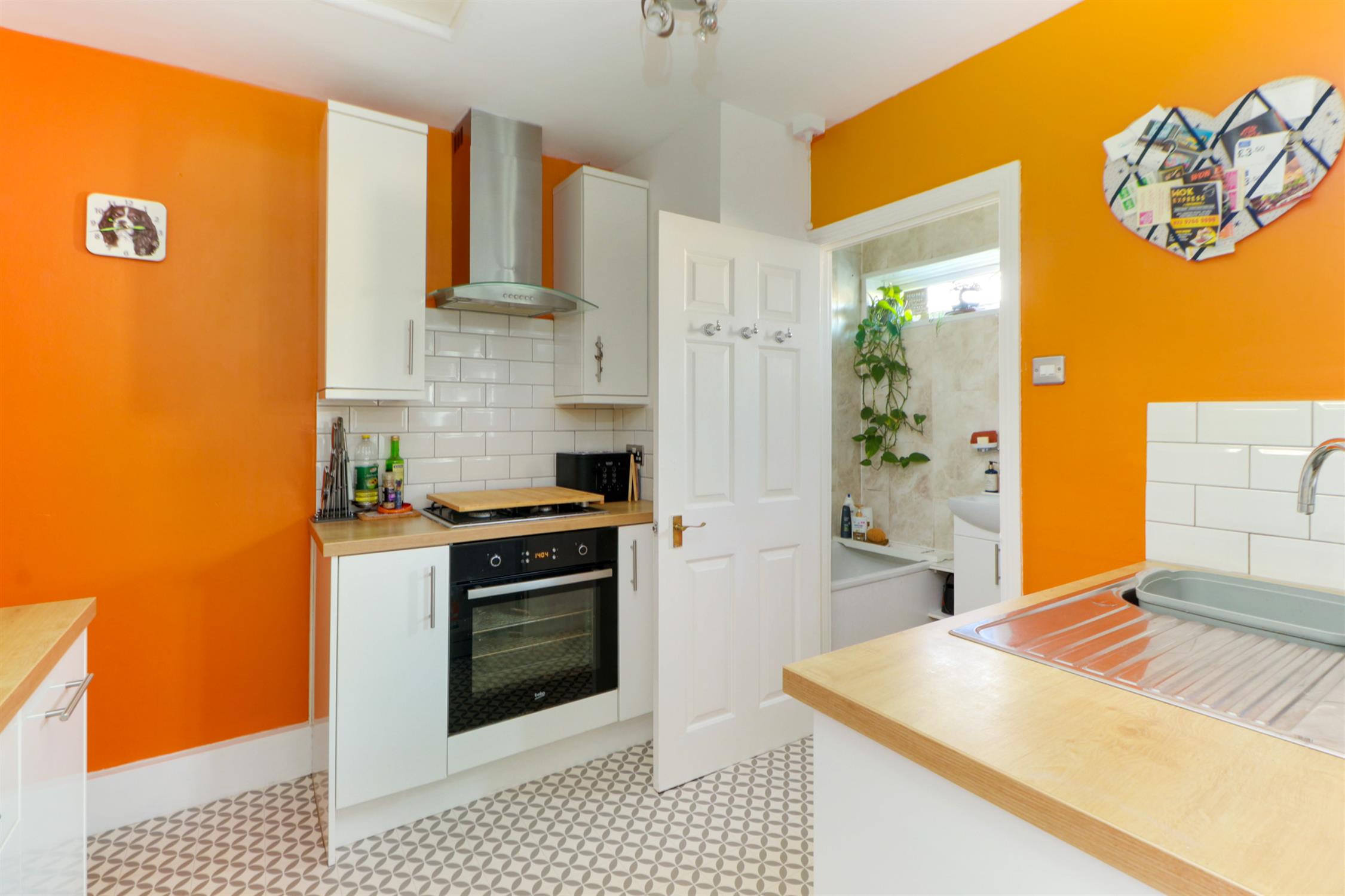 Smooth ceiling, loft hatch access, a range of wall and base-mounted units with work surfaces over, inset sink and drainer, gas hob with extractor fan over, oven, built in microwave oven, space for appliances and vinyl flooring.