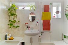 Smooth ceiling, obscured UPVC double-glazed window, bath with shower over, tiled splash back, wash hand basin, low level W.C and vinyl flooring.