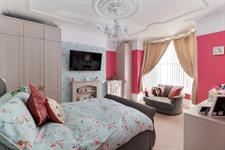 Textured ceiling, ornate cornicing, picture rails, storage cupboards, fitted carpet and doors into;