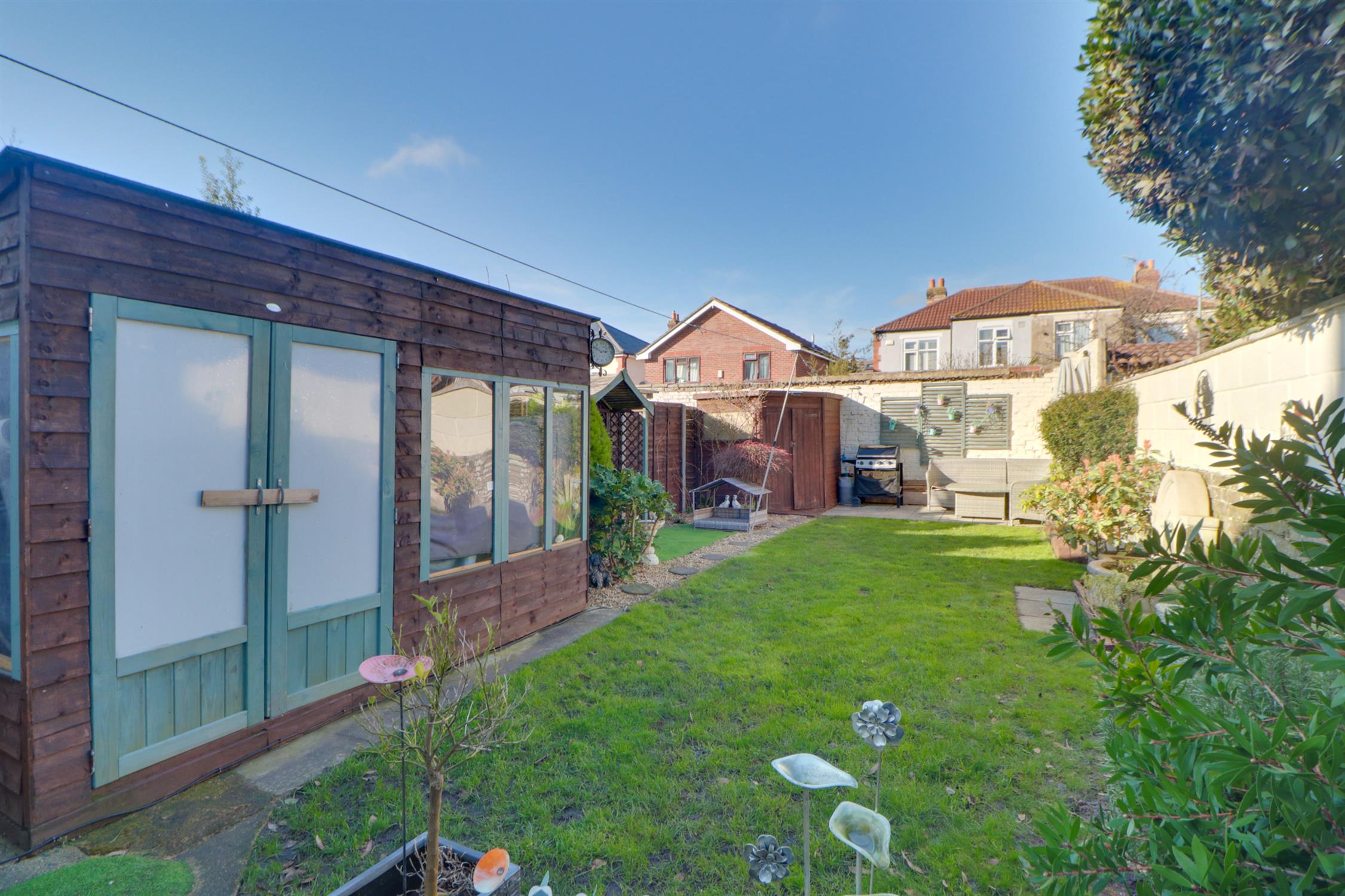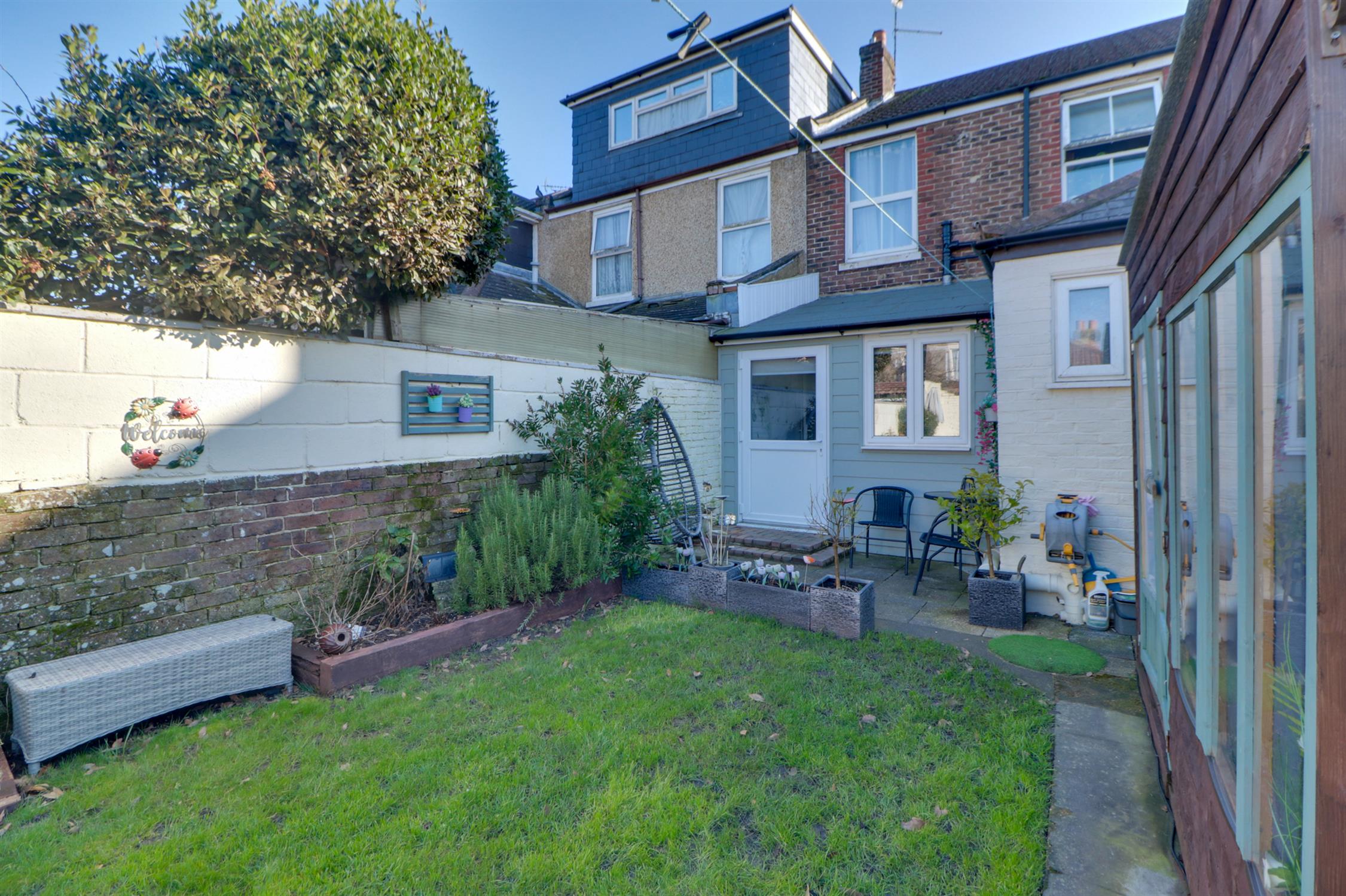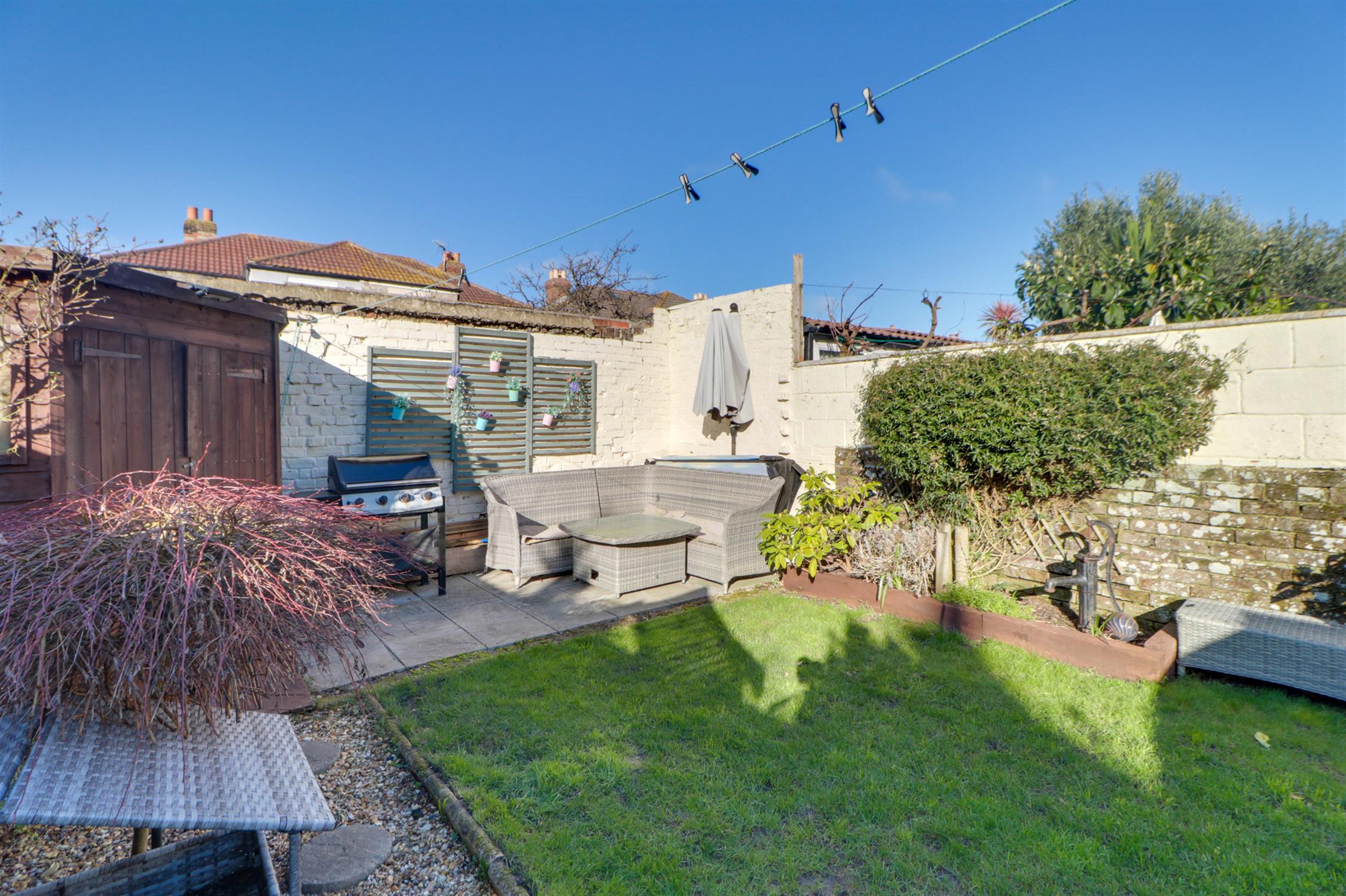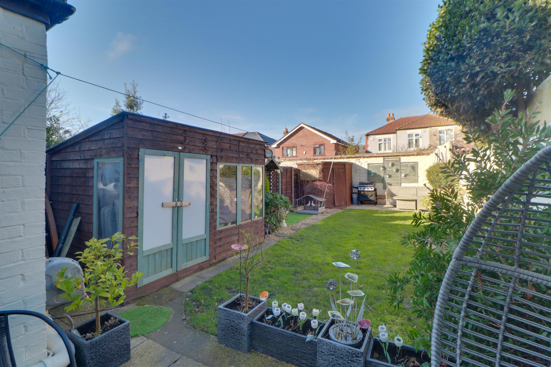 The property enjoys access to a private rear garden, mainly laid to lawn with additional seating areas and useful timber outbuildings providing storage or hobby space.