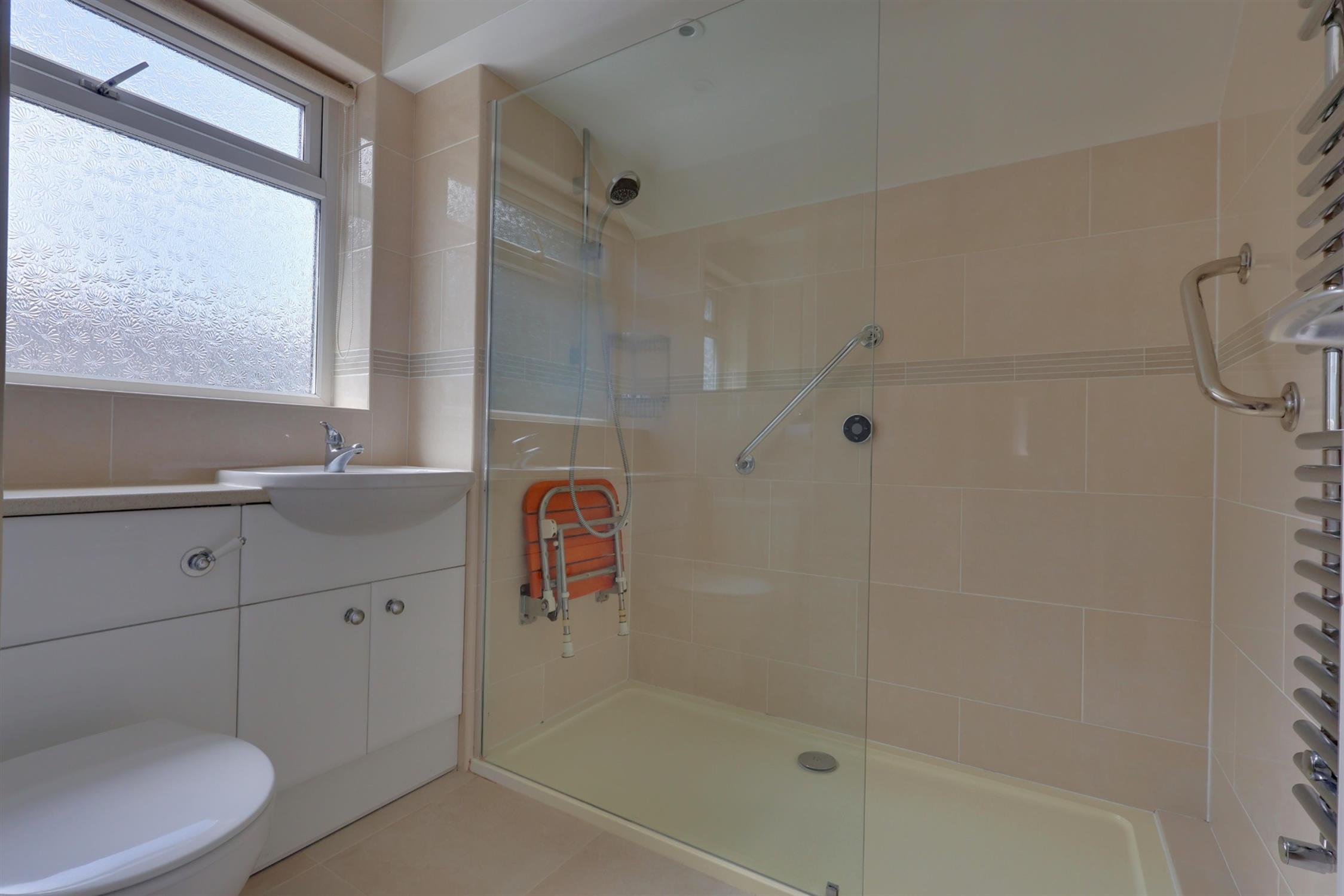 Modern and well-appointed, the bathroom features a generous walk-in double shower with glazed screens, an obscure double-glazed window to the rear, extractor fan, tiled walls, low-level WC vanity wash basin, and a ladder-style radiator.