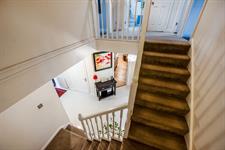 The stairs rise and branch to two sections of the first floor, the master suite on the right and the remaining accommodation on the left.