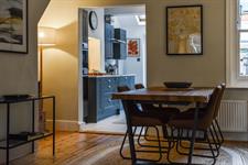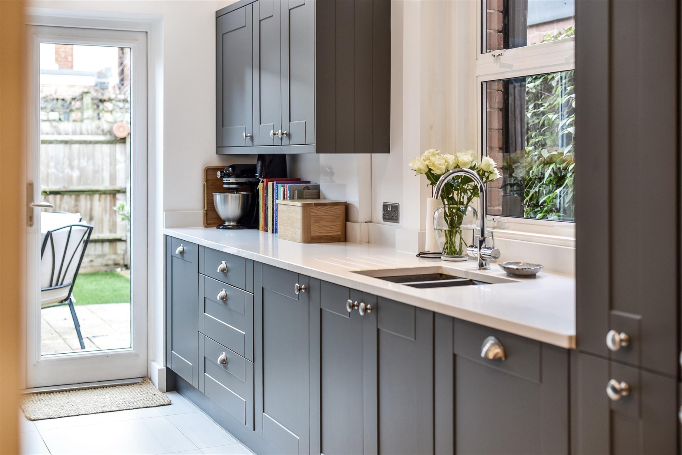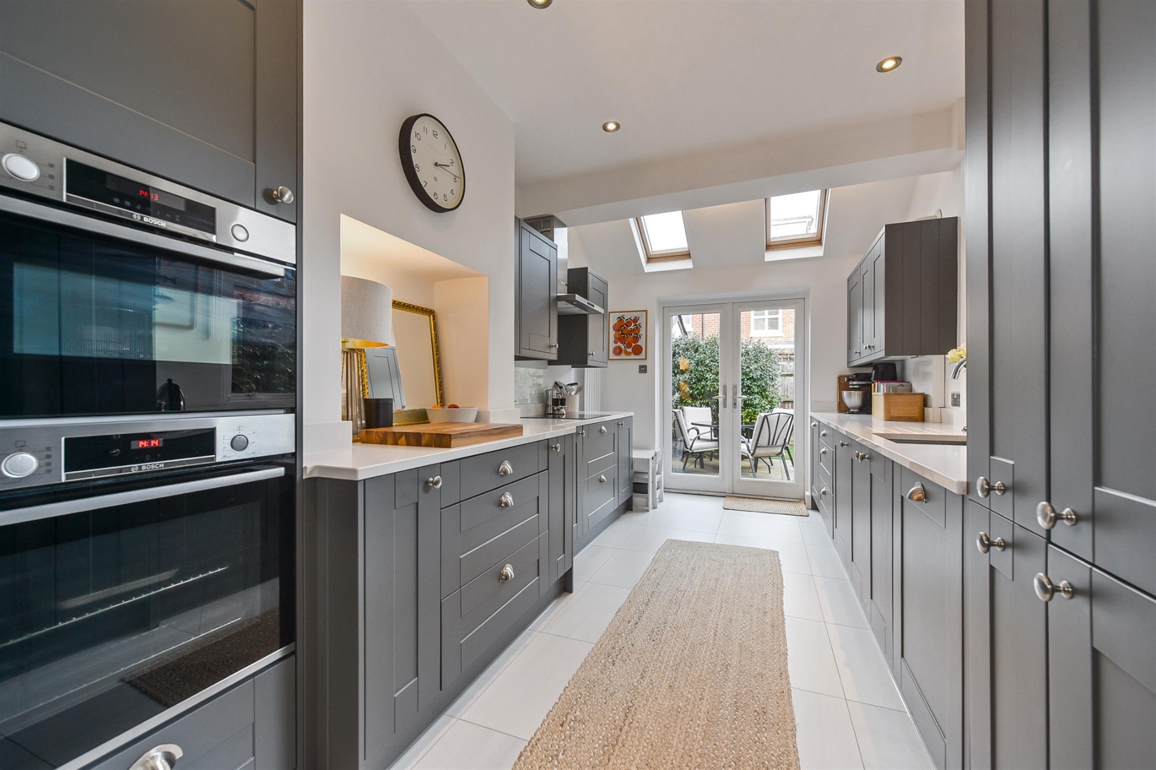 A contemporary yet classic kitchen, fitted to a high standard and presented immaculately. The worktops are solid Quartz, with high and low level units. Integrated appliances include fridge freezer, Bosch double oven, induction hob with extractor, and dishwasher. There is a window to the side return and two skylights for extra light. Double doors lead onto the rear garden.