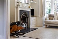 A very warm and welcoming room with classic features including iron fireplace with granite hearth, white surround and mantle. The box bay window has louvred shutters fitted on the lower sections.
