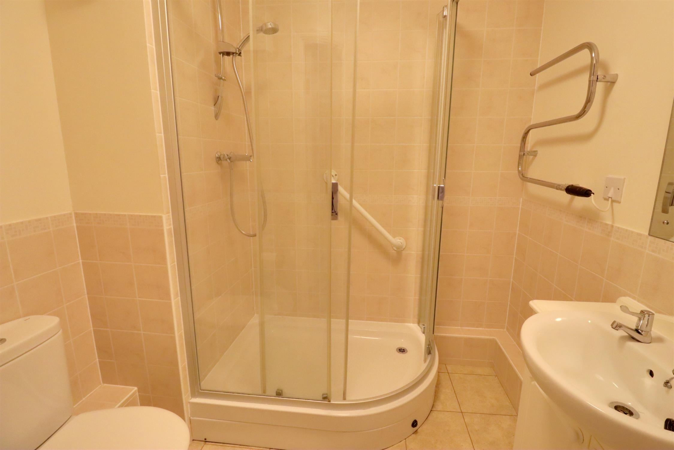 With corner shower cubicle, vanity unit with wash basin having cupboards below, mirror and strip light over, close coupled wc, heated towel rail, automatic extractor fan and part tiled walls.