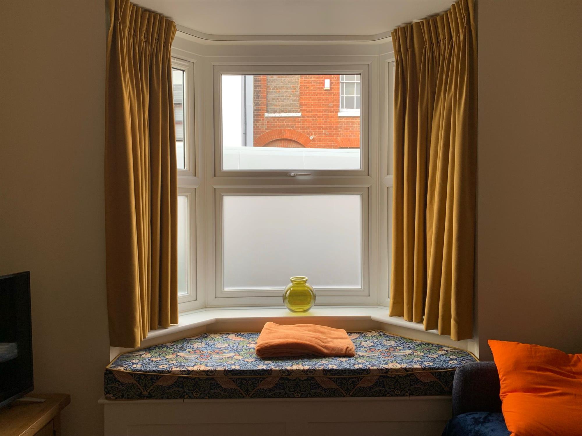 The cosy lounge has 2 sofas and a window seat.