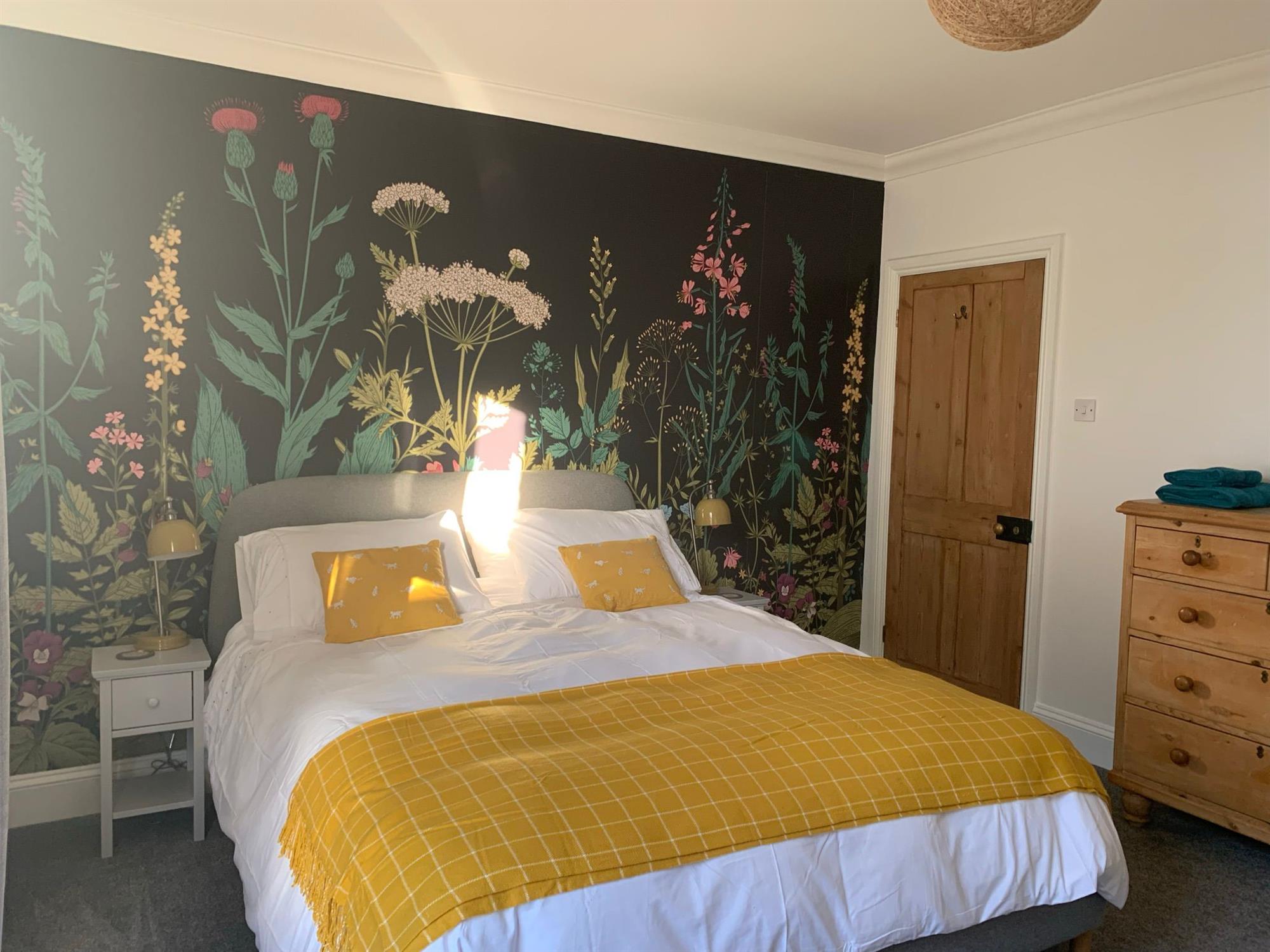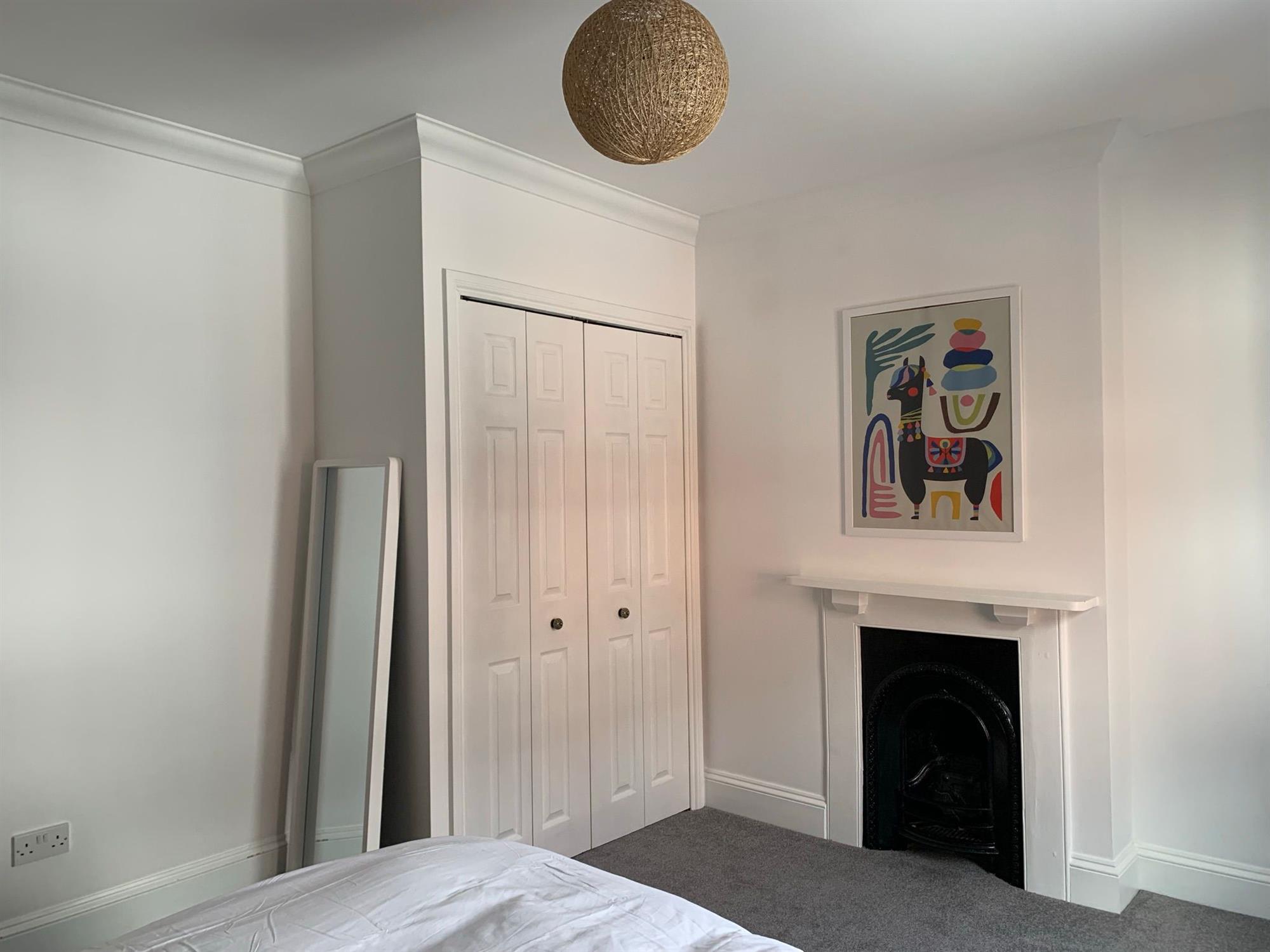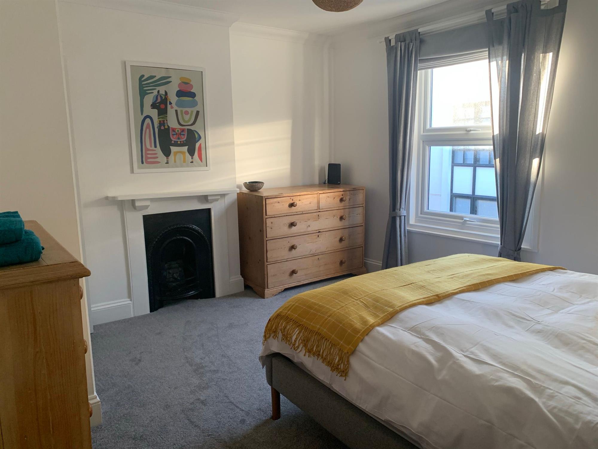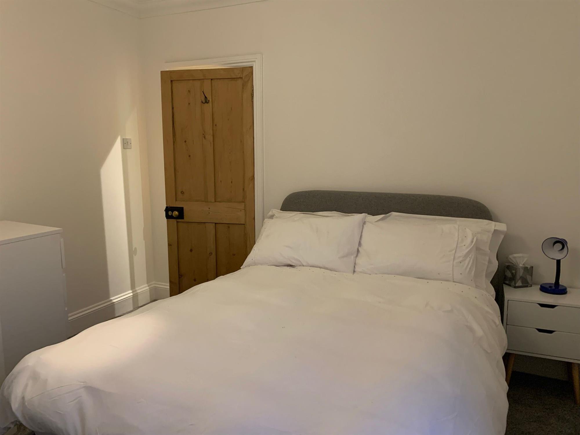 Upstairs there is a large king room with a super king-size bed, two bedside tables with lamps, a built-in wardrobe, featuring a chimney and a chest of drawers. TV is also included.