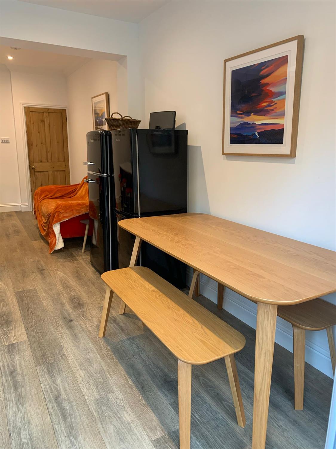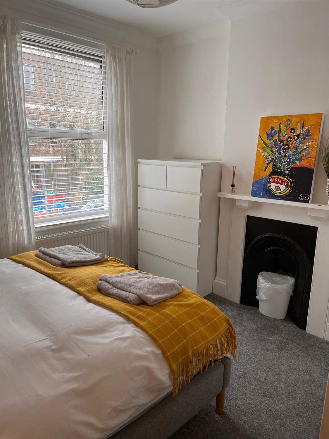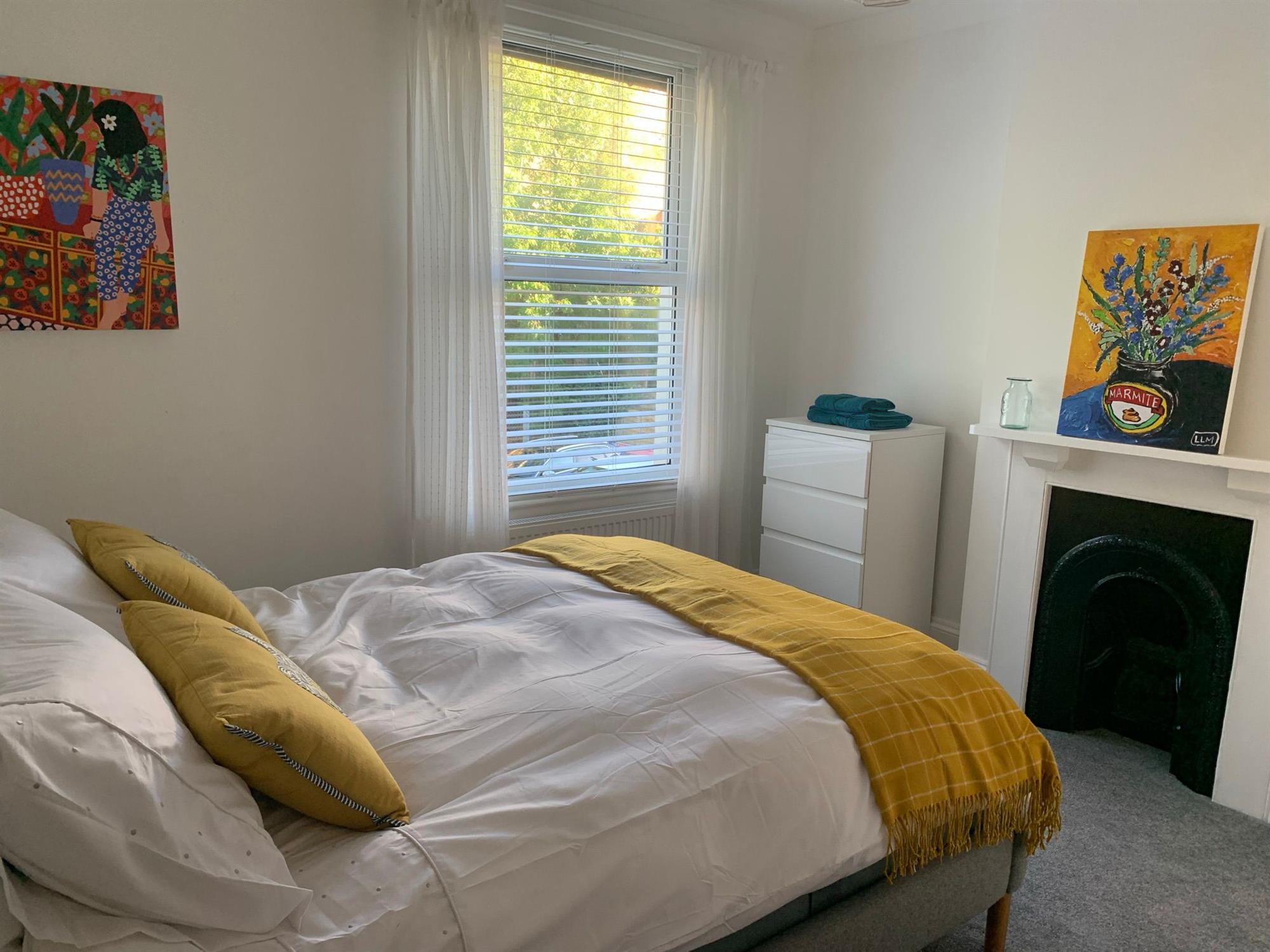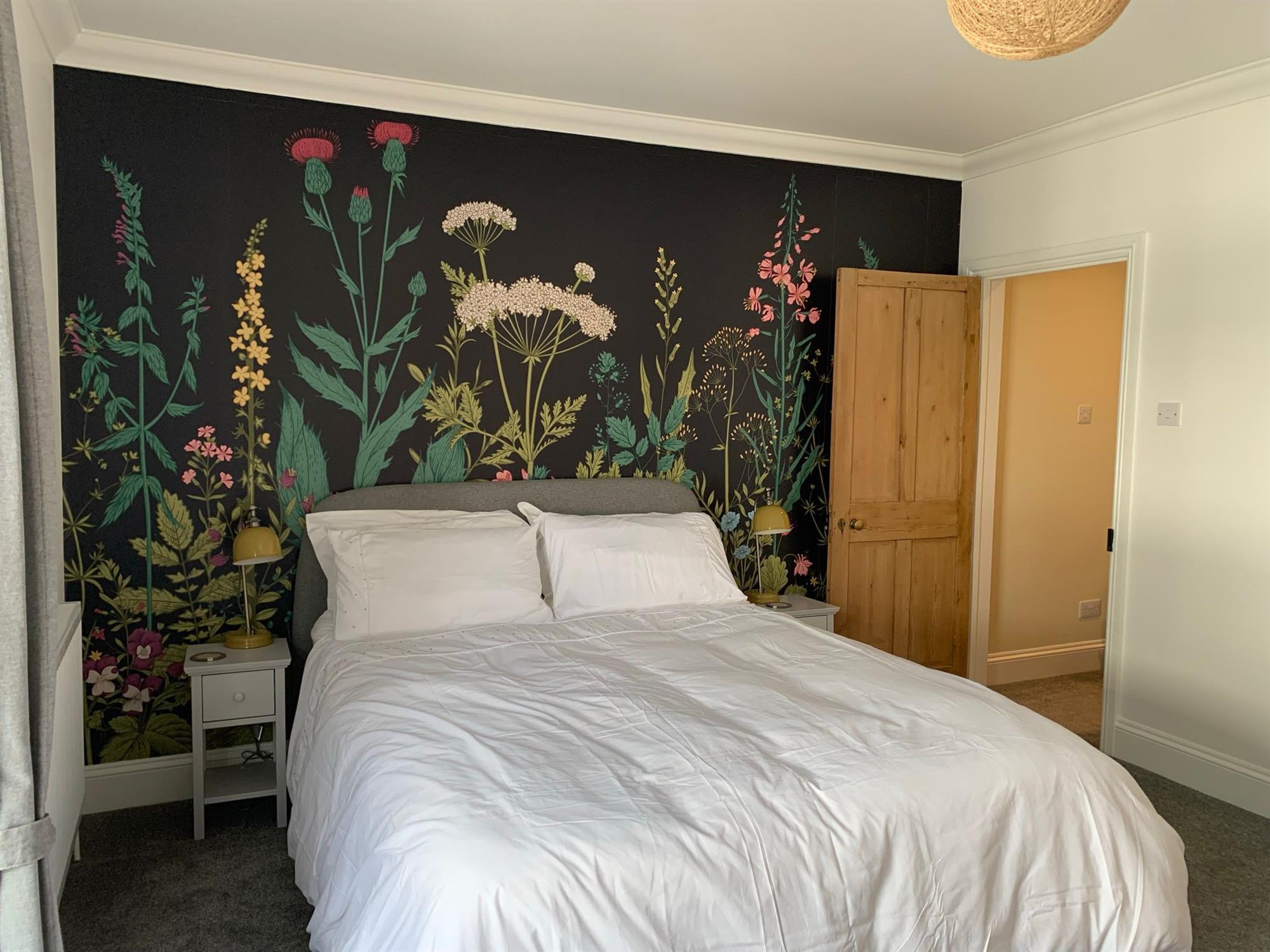 Upstairs there is a large king room with a super king-size bed, two bedside tables with lamps, a built-in wardrobe, featuring a chimney and a chest of drawers. TV is also included.