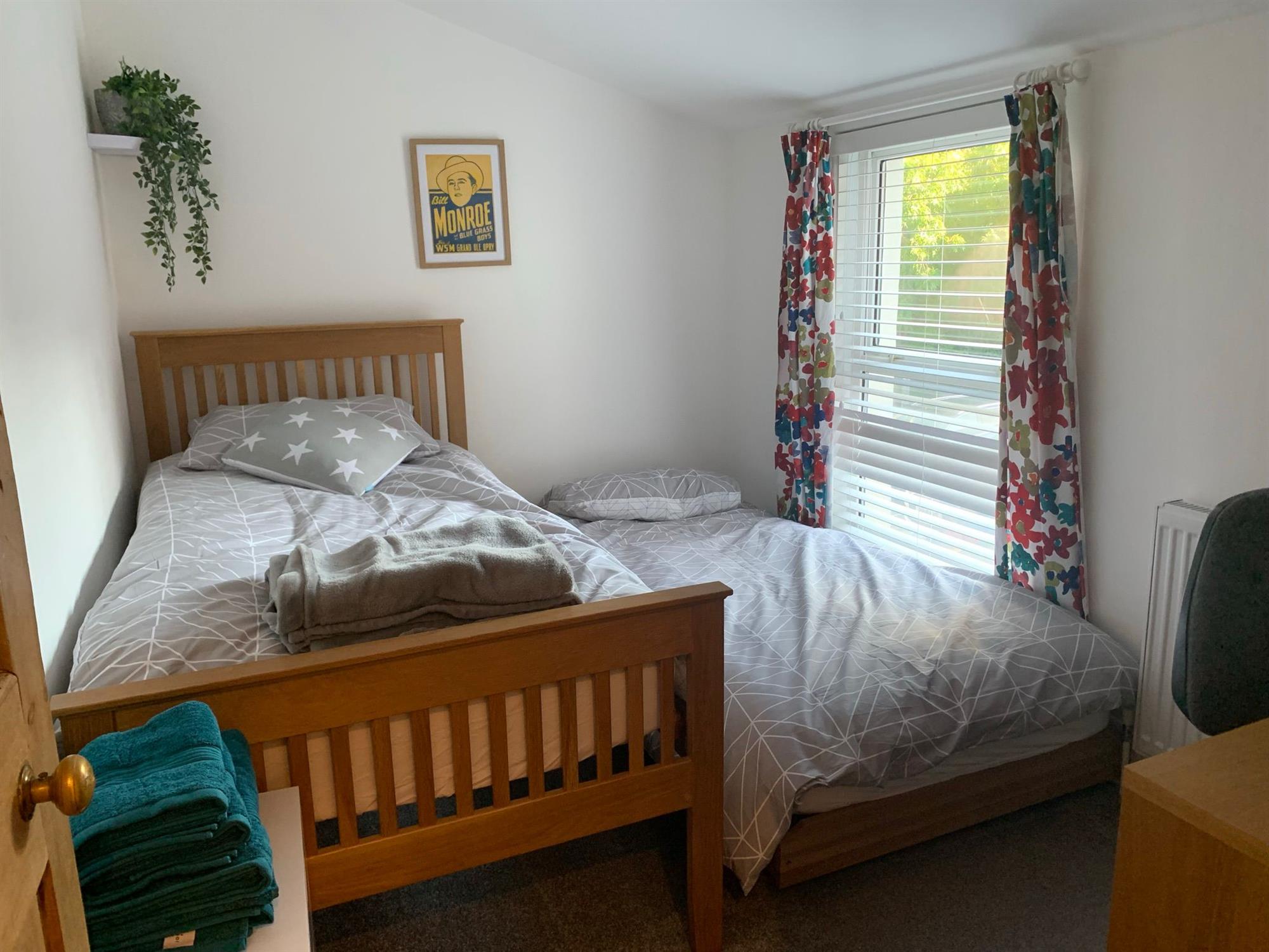 The third bedroom is a large single room, the bed has a trundle bed underneath and a desk incl.