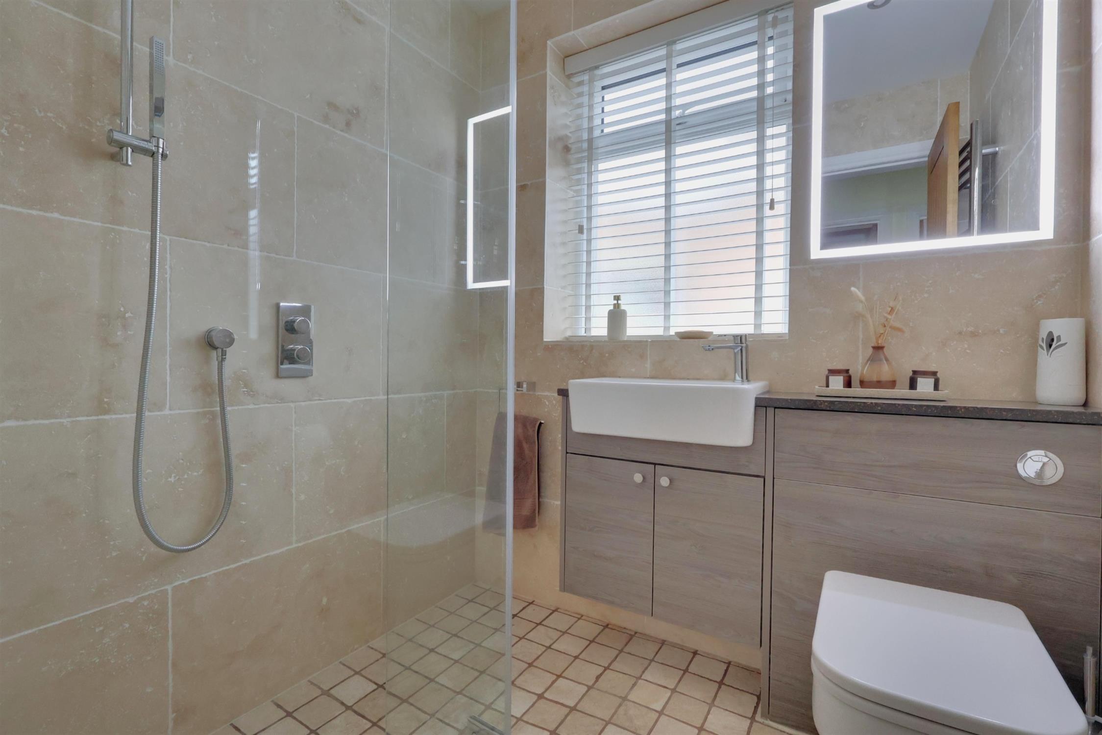 Walk-in shower cubicle. WC. Ceramic sink. Heated towel rail. Tiled flooring and walls. Frosted double glazed window.